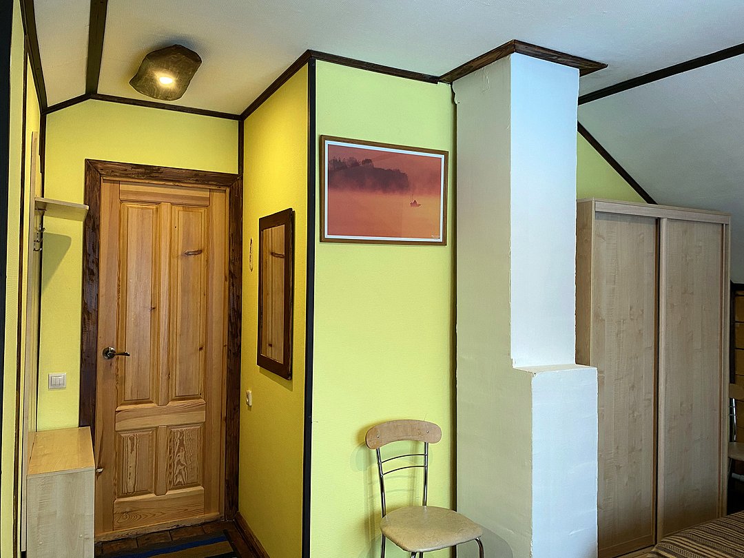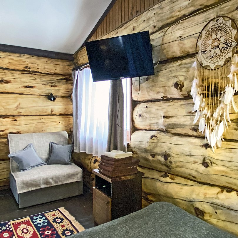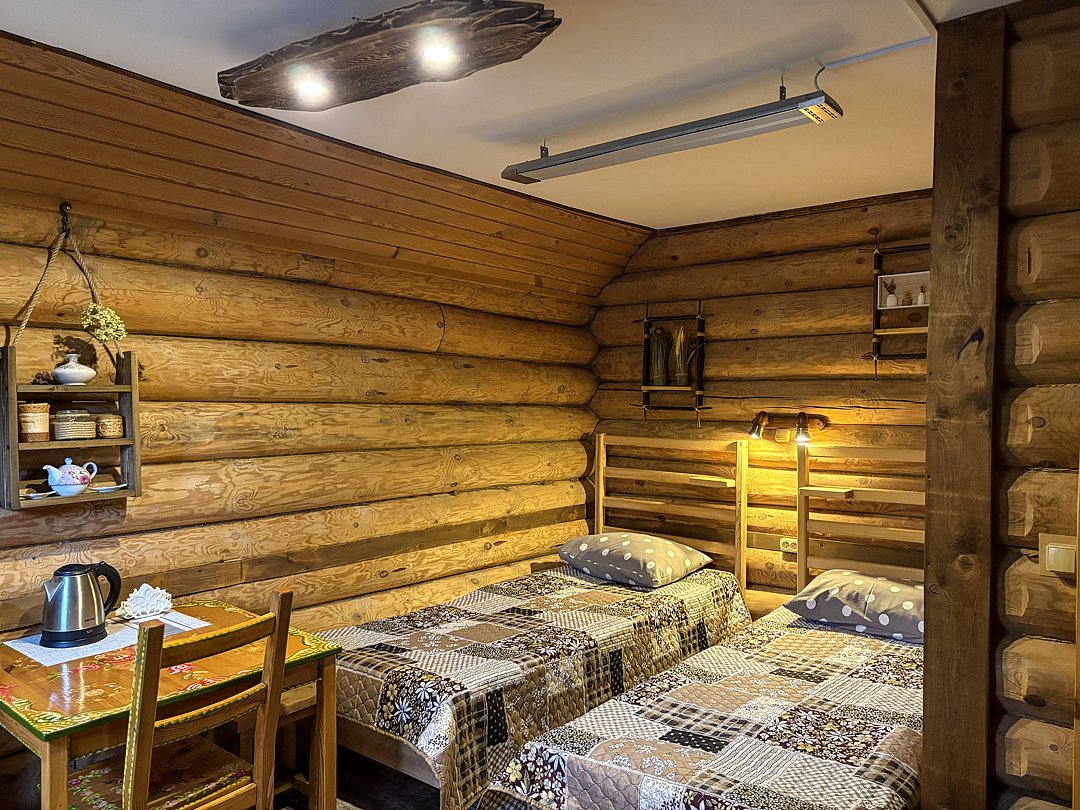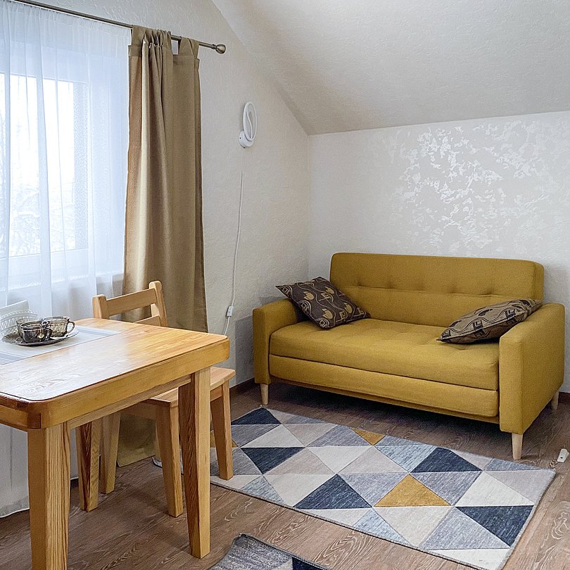 Двухкомнатный номер гостевого комплекса «Пчёлки» с собственной ванной комнатой и доступом к террасе подойдёт для спокойного семейного отдыха