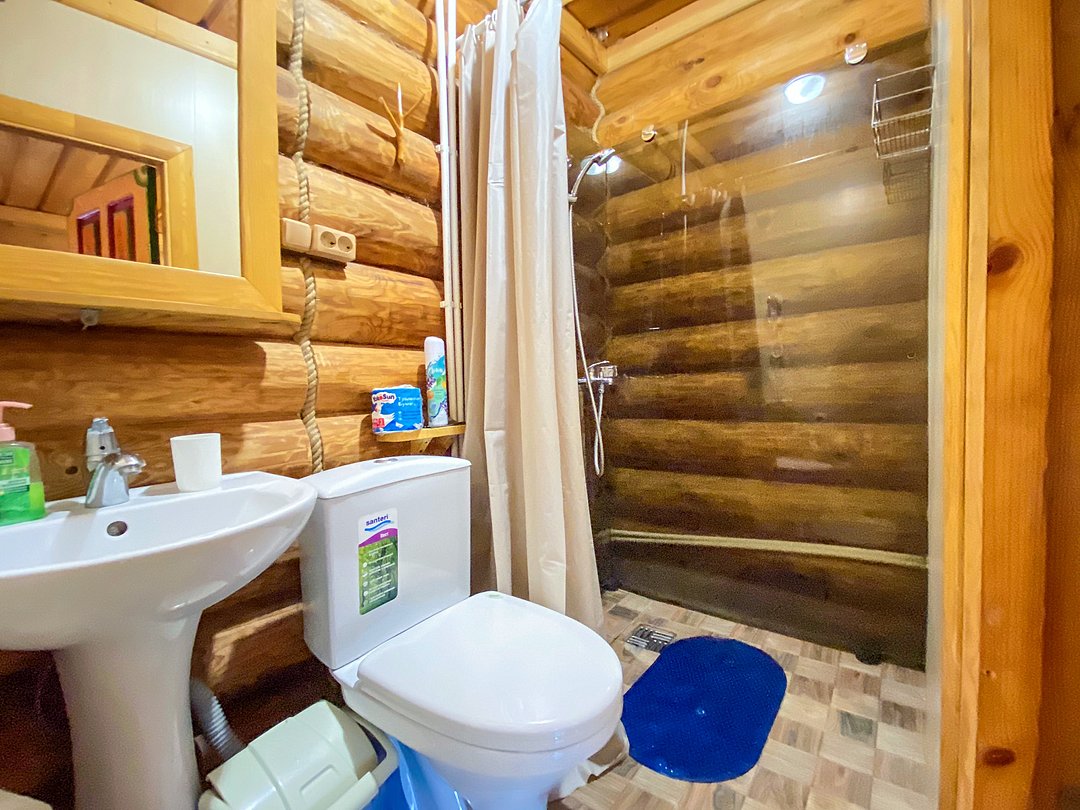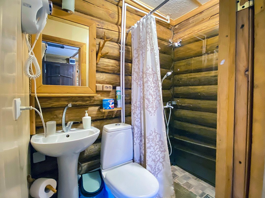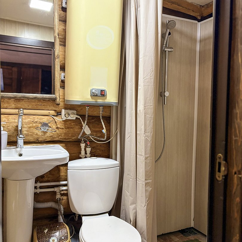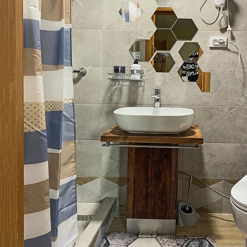 Санузел в номере: душевая кабина, унитаз, раковина, зеркало, горячая и холодная вода.