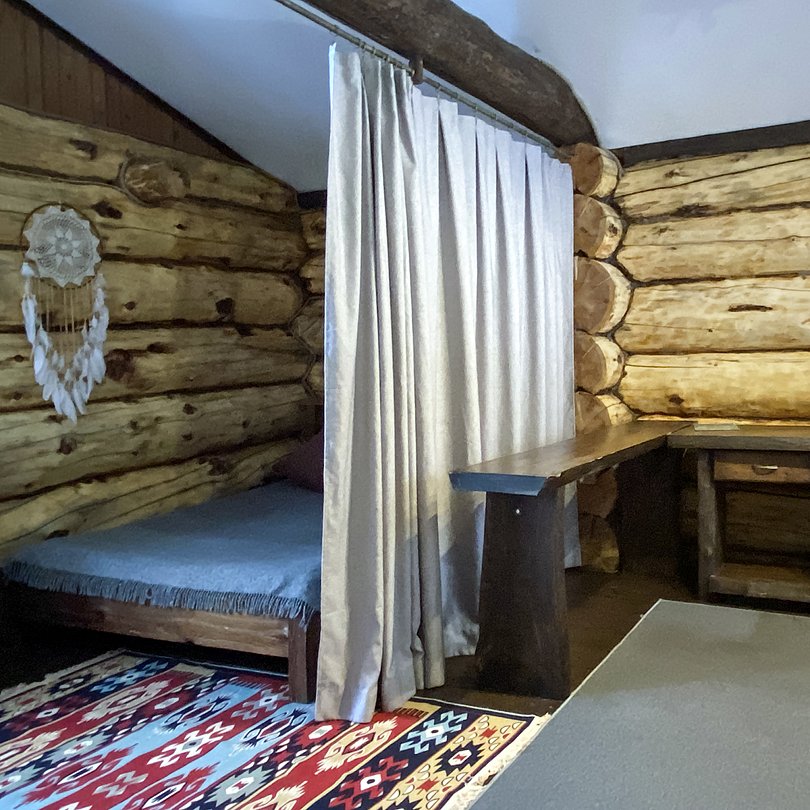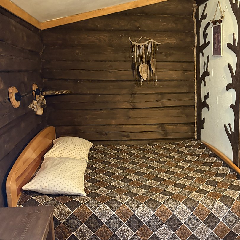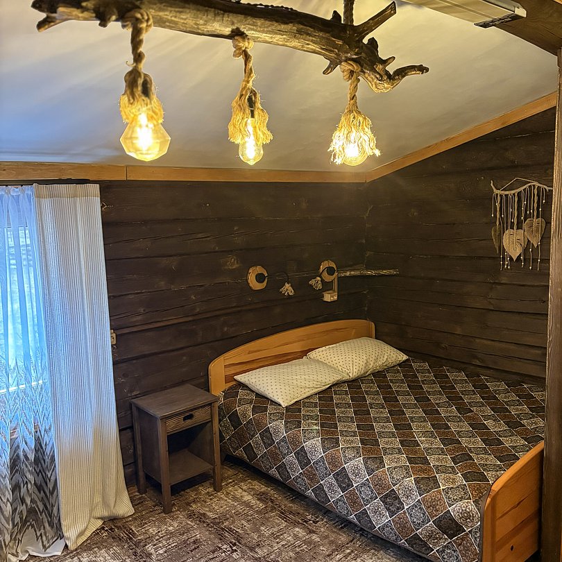 Отдельно стоящий двухэтажный уютный дом с тремя отдельными комнатами, общими санузлом и кухонной зоной на втором этаже, видом на фруктовый сад и пасеку.