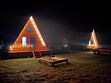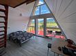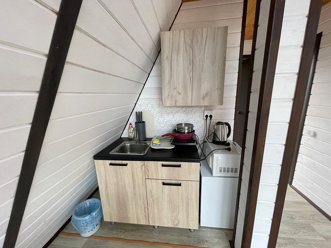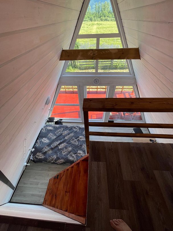 Уютные А-фреймы имеют панорамное остекление с видом на горы и выходом на большую террасу. В каждом домике есть кухонная зона с полным набором техники и принадлежностей для самостоятельного приготовления пищи, комфортные ортопедические матрасы для вашего отдыха, современный санузел с душем.