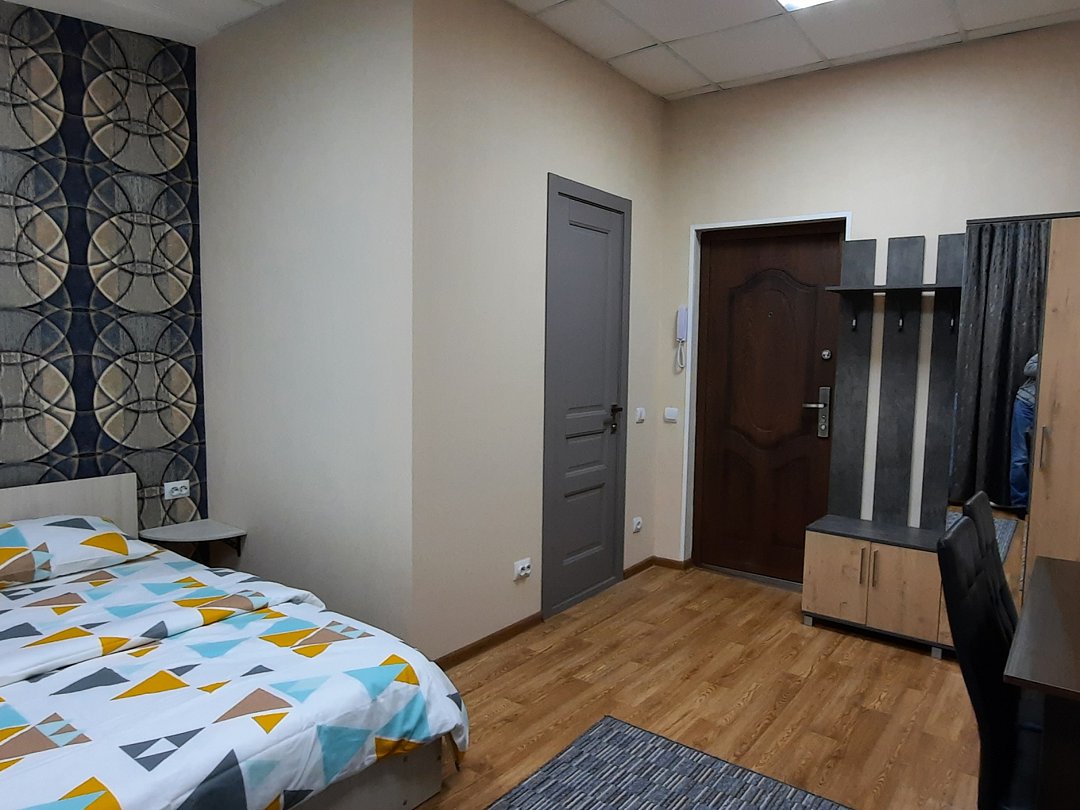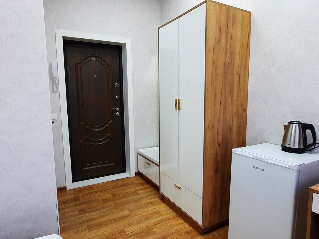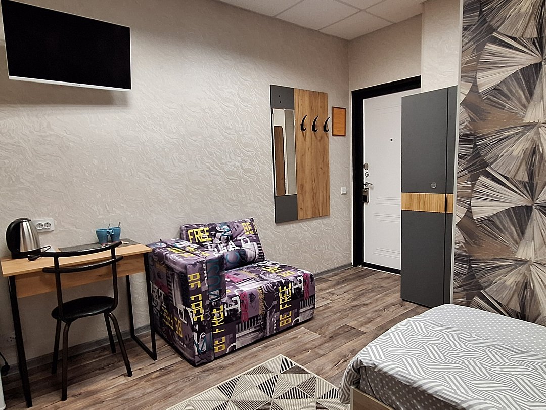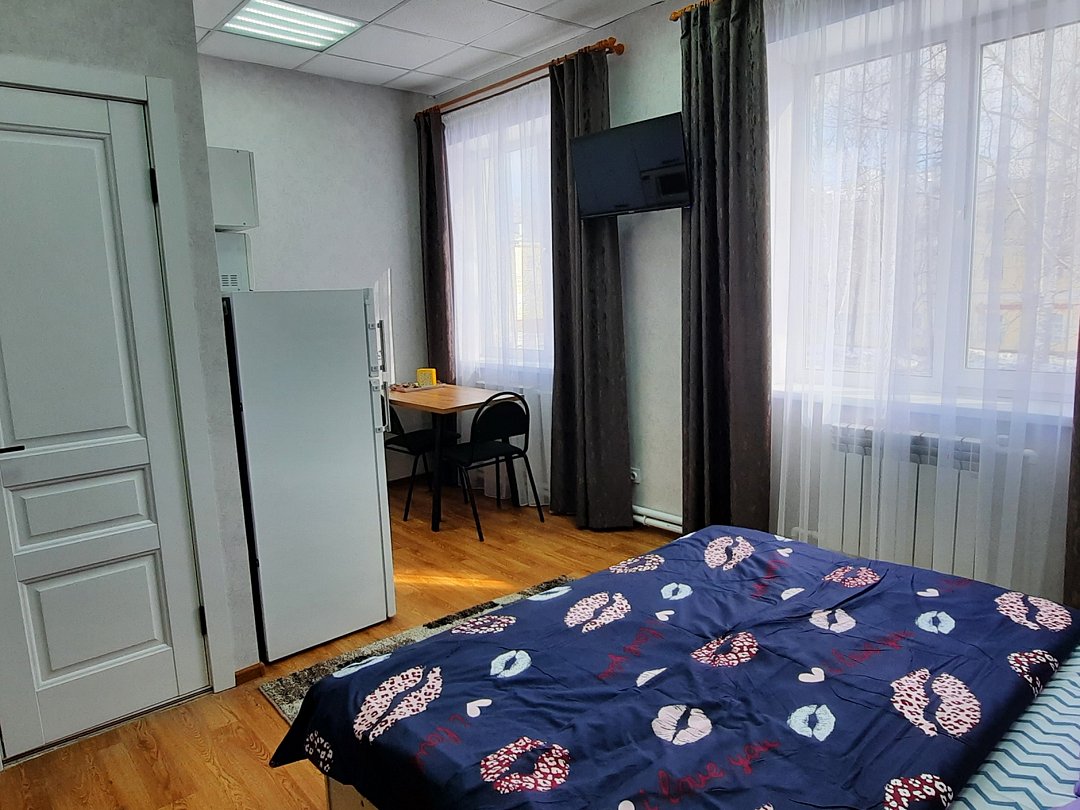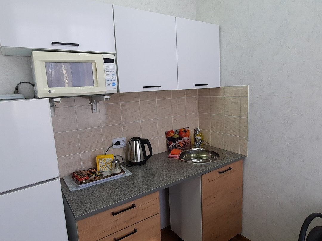 Уютный, двухместный, однокомнатный номер без балкона с кухней, двуспальная кровать с прикроватными тумбочками, шкаф, стол. Kухня укoмплeктованa нeoбхoдимой поcудой и куxонными пpинaдлежноcтями. Cовpеменная мебель и бытовая техника: жк телевизор, холодильник, микроволновка, эл.чайник. Современная ванная комната, полотенца, тапочки.В номере