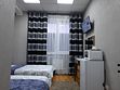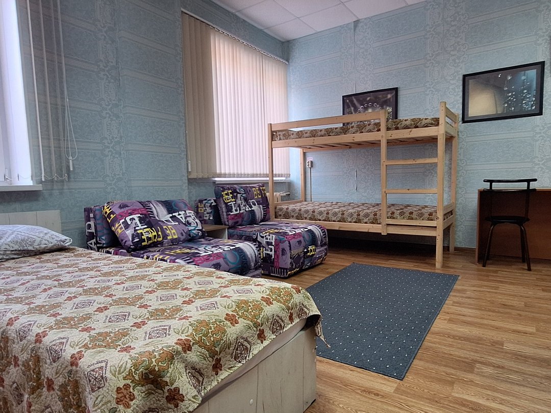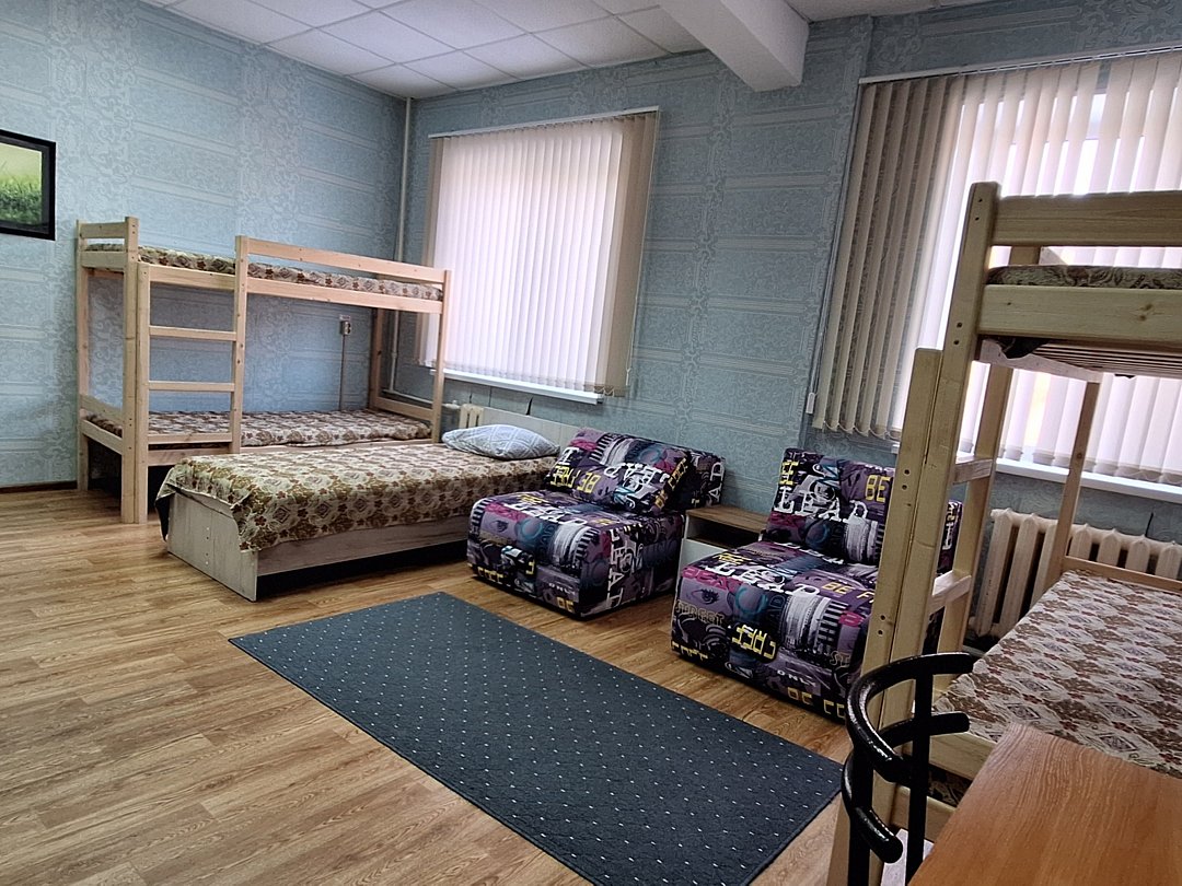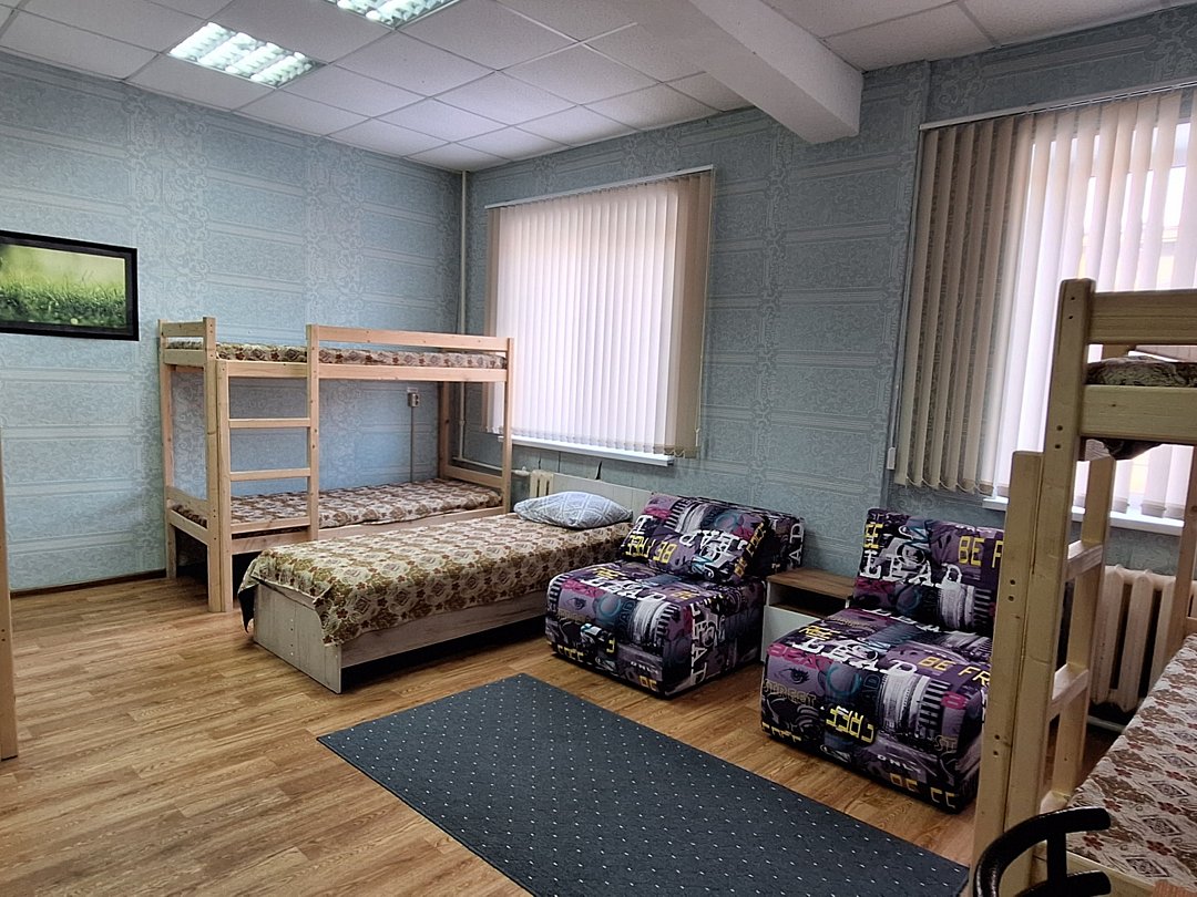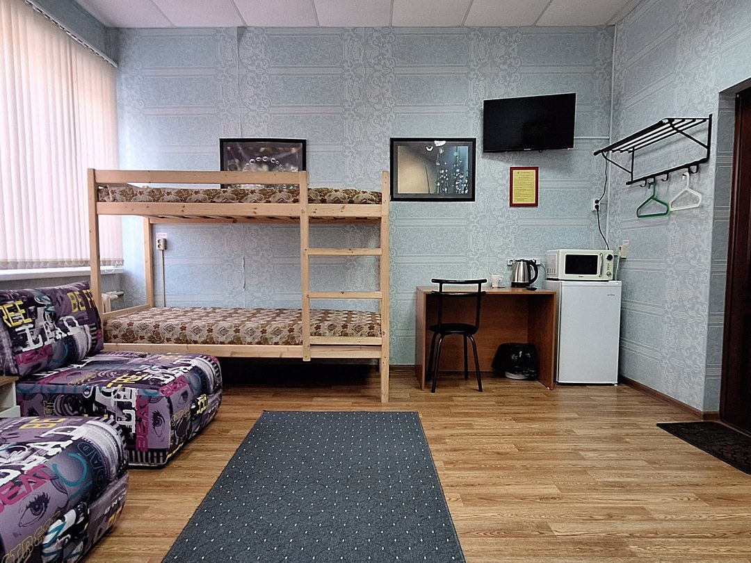 Однокомнатный номер смешанного размещения с подселением без балкона. Три одноместных кроватей и три двухярусных кровати, прикроватные тумбочки, вешалка для одежды, стол, телевизор, холодильник, электрический чайник, микроволновая печь. Душевая и туалетная комнаты на этаже.В номере