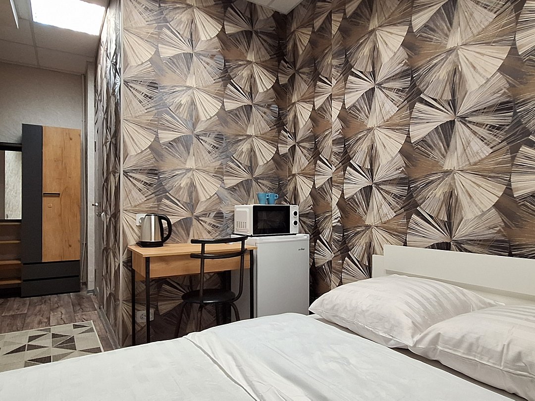 Уютный двухместный однокомнатный номер с одной двуспальной кроватью без балкона. В номере есть все, для комфортного проживания: двуспальная кровать, прикроватная тумба, шкаф для одежды, стол, электрический чайник, холодильник, телевизор с плоским экраном, СВЧ-печь, бесплатный Wi-Fi. Собственная ванная комната, полотенца, тапочки.В номере
