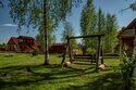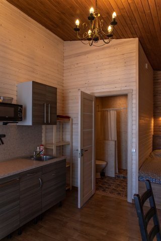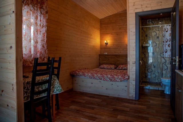 Комфортабельные коттеджи рассчитаны на компанию или семью от 2 до 8 человек. Перед каждым домом оборудована собственная мангальная зона и терраса, из окон открываются панорамные виды на озеро. В каждом коттедже есть мини-кухня, санузел с душем, вся отделка и мебель выполнены из натуральных материалов. В домах проведено отопление, поэтому они подходят для круглогодичного проживания.