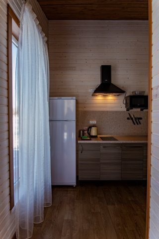 - кухня-гостиная: газовая плита, электрочайник, вся необходимая посуда, холодильник, проточный фильтр для питьевой воды.
