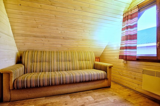 - спальня-гостиная с 2-х спальным диваном, возможно одно дополнительное место или по необходимости детская кроватка, печь-камин, цифровое телевидение.
