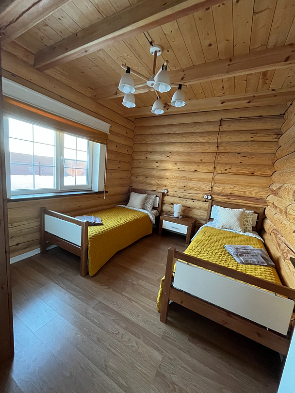 Первый этаж: каминный зал, кухня — столовая с современной бытовой техникой, камин дровяной, санузел, душевая кабина, две спальни, в каждой по две односпальные кровати, которые можно соединить в одну большую кровать, рабочий кабинет.