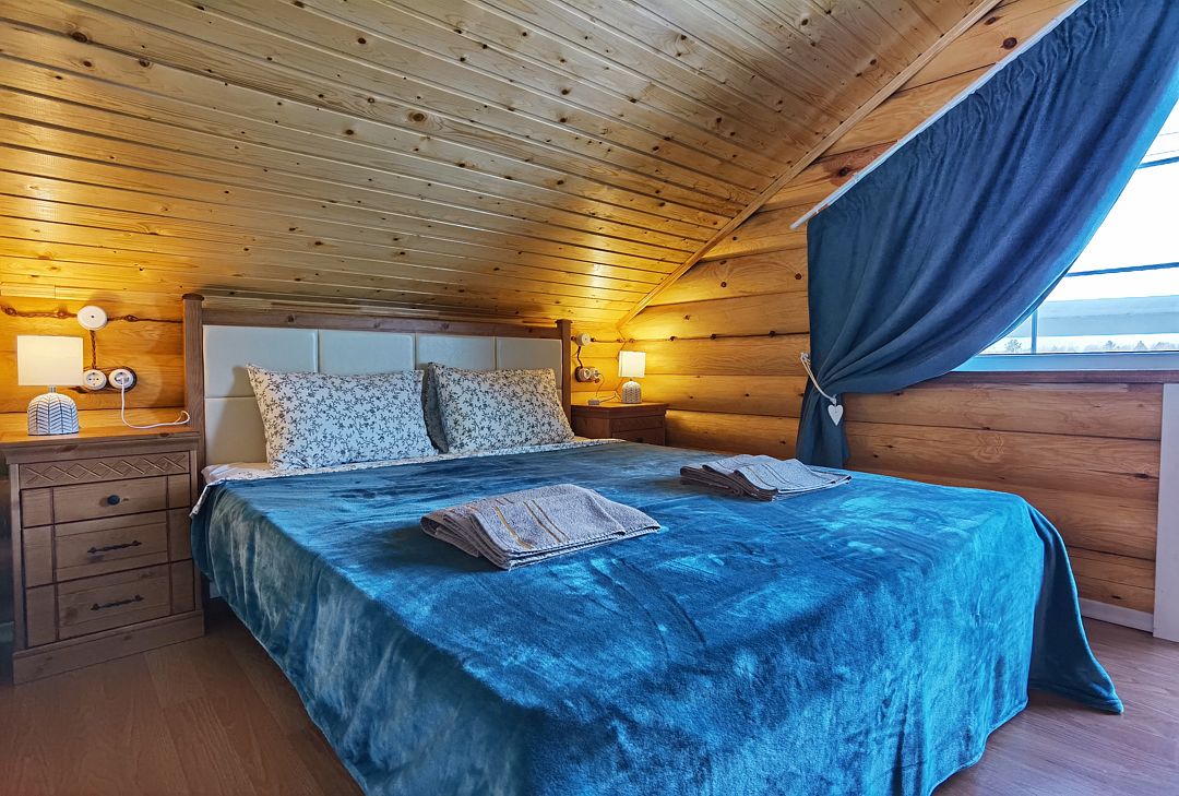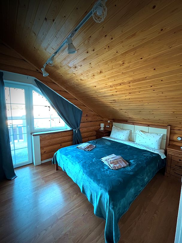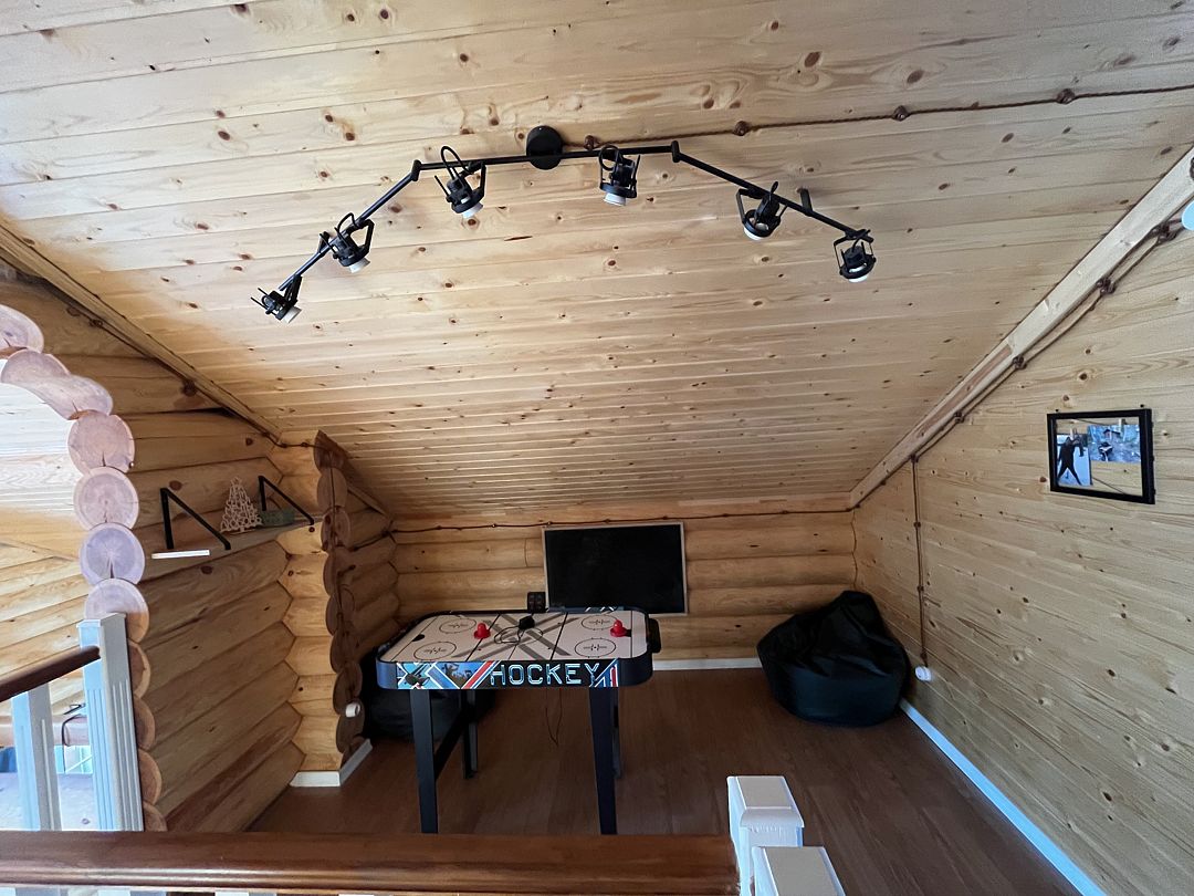 Второй этаж: две спальни с двуспальными кроватями, санузел, душевая кабина, игровой холл с настольными играми, выход с каждой спальни на балкон с видом на лес.