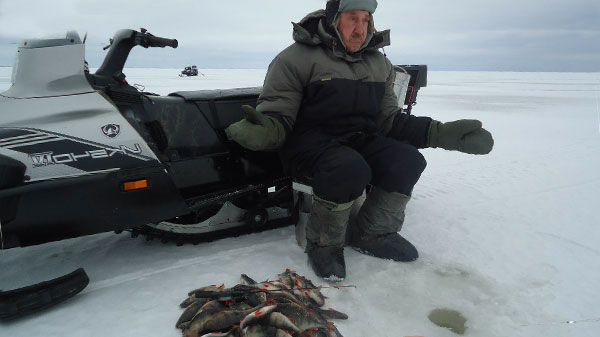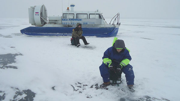 Доставляют на лед на снегоходах и судне на воздушной подушке Хивус-10. Цены указаны в обе стороны.