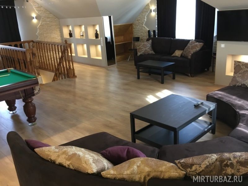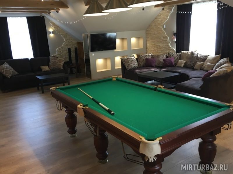 Аренда включает в себя первый этаж с большим столом. И третий этаж с бильярдом и баром.