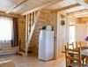 На первом этаже коттеджа расположены вместительная гостиная с удобным разбирающимся диваном, теплым камином, кухонная зона с большим обеденным столом, туалет и душевая комната, терраса с массивной мебелью. На втором этаже расположены три спальни с прекрасным видом на речку.
