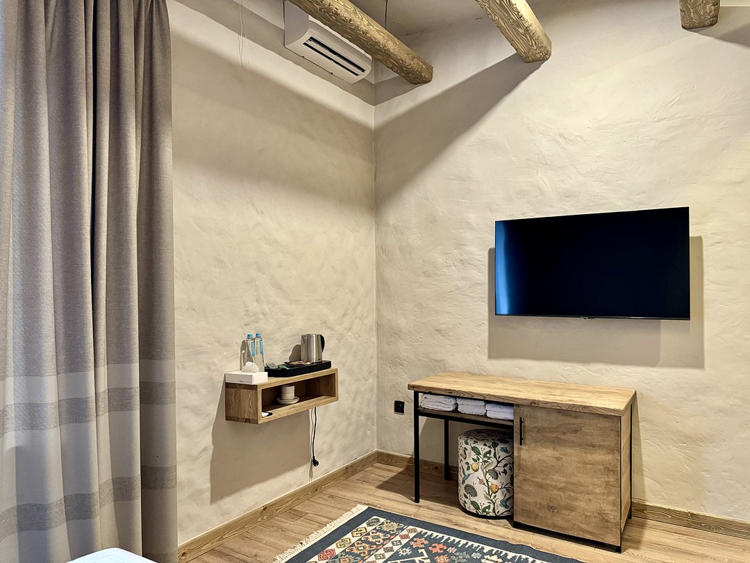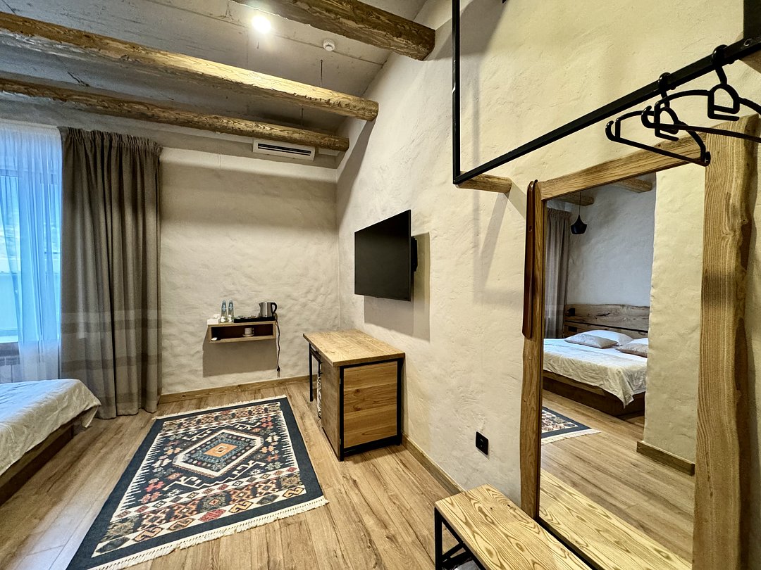 Не менее просторный и комфортный номер стандарт. Кровати могут как быть раздельными, так и стать одним цельным спальным местом. ТВ, холодильник, кондиционеры, санузел и душ.