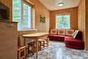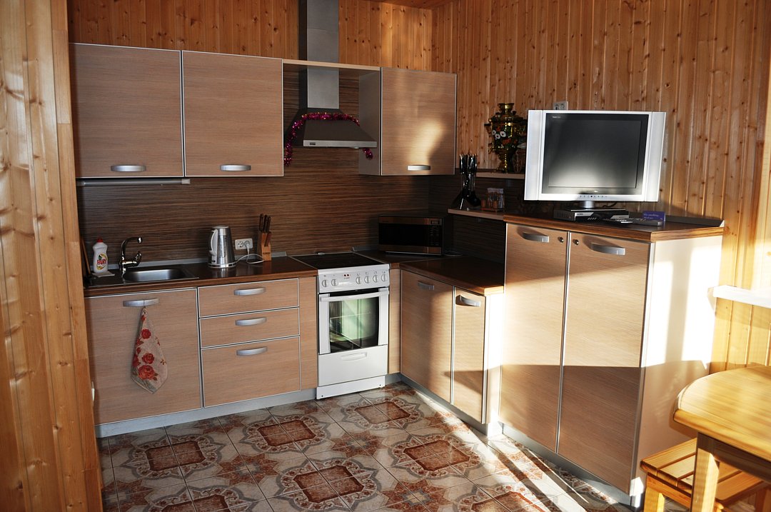 По-домашнему уютный двухэтажный 4-х комнатный номер люкс. 1-й этаж кухня-столовая, 2-й этаж 3 спальни. Кухня: 4-х конфорочная эл. плита с духовкой, СВЧ-печь, вся посуда, холодильник, эл.чайник, вентиляция, теплые полы, ТВ, мягкая мебель. В номере 2 сан.узла: душ. кабина, биде, эл. водонагреватель, мойка, унитаз, теплые полы, сушилка для белья. Вход на 2-й этаж по деревянной лестнице. Две отдельные спальни с 2-х спальными кроватями, в третьей-раскладные диван и кресло, ТВ. Прихожая: стойка для лыж и сноубордов, зеркало, теплые полы. Отделка номера в стиле загородного деревянного дома. Полы: 1-й этаж керамическая плитка с подогревом, 2-й этаж ковровое покрытие с подогревом. Вид из окон на сосновый бор и горную речку.
