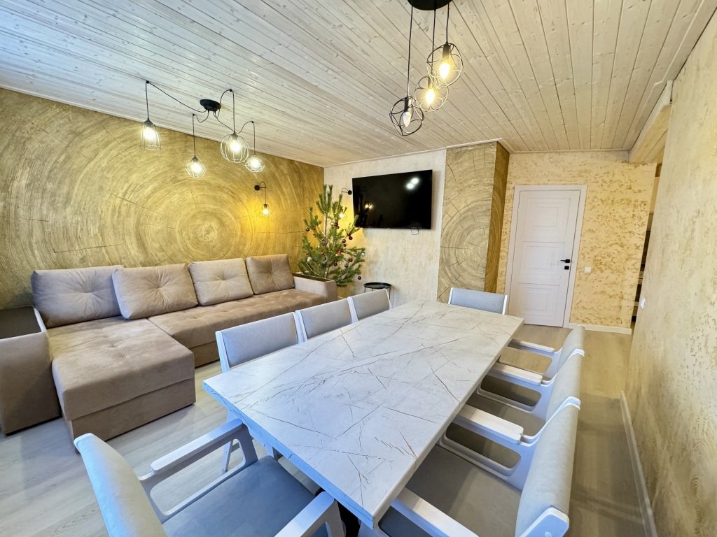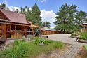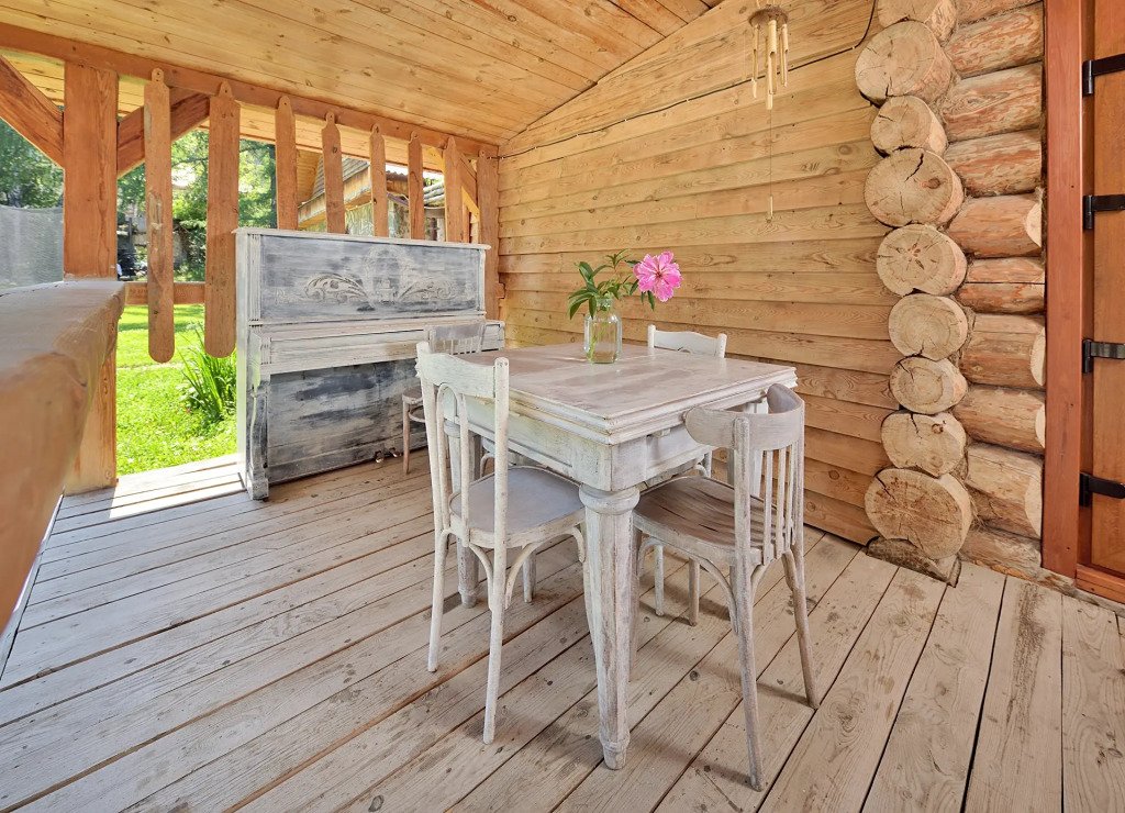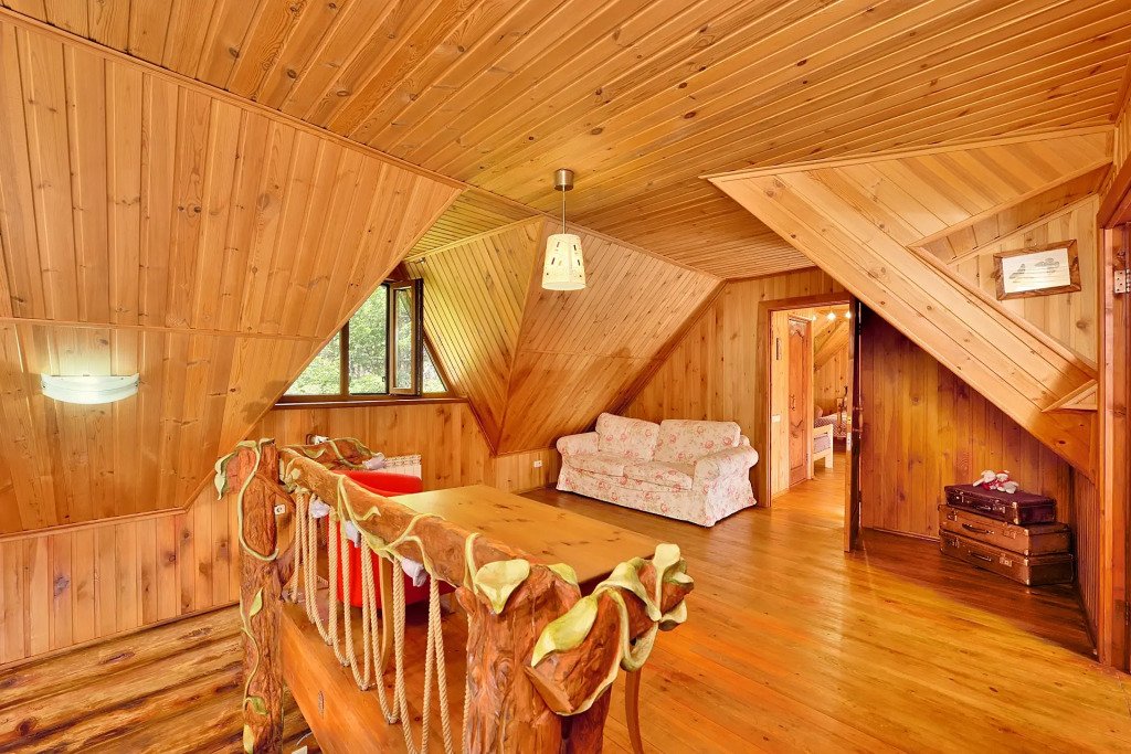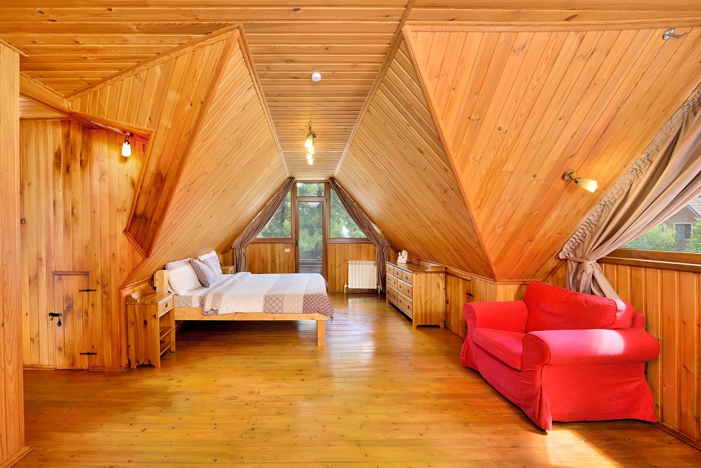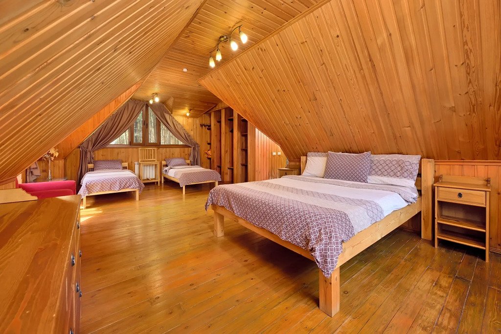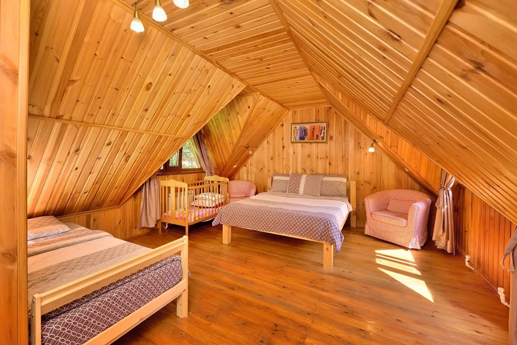 Первый домик (180 кв. м.) рассчитан на 13 человек (9 основных и 4 доп. места). Здесь есть 3 спальни, 3 санузла с душевыми, кухня-гостиная. Территория — 12 соток, парковка на 6 машин, веранда и беседка.