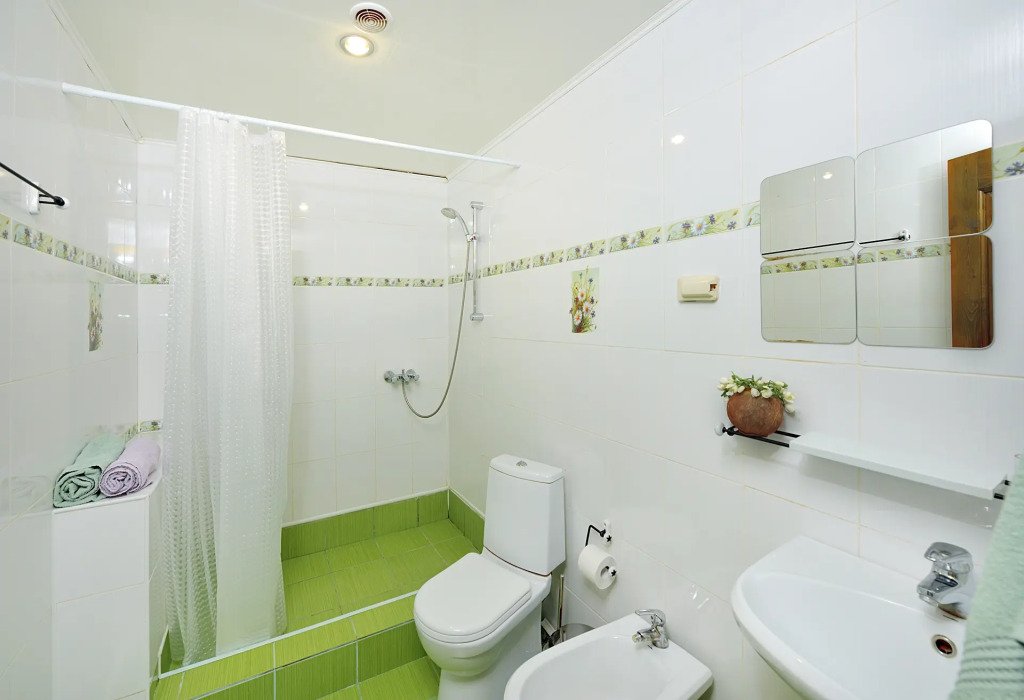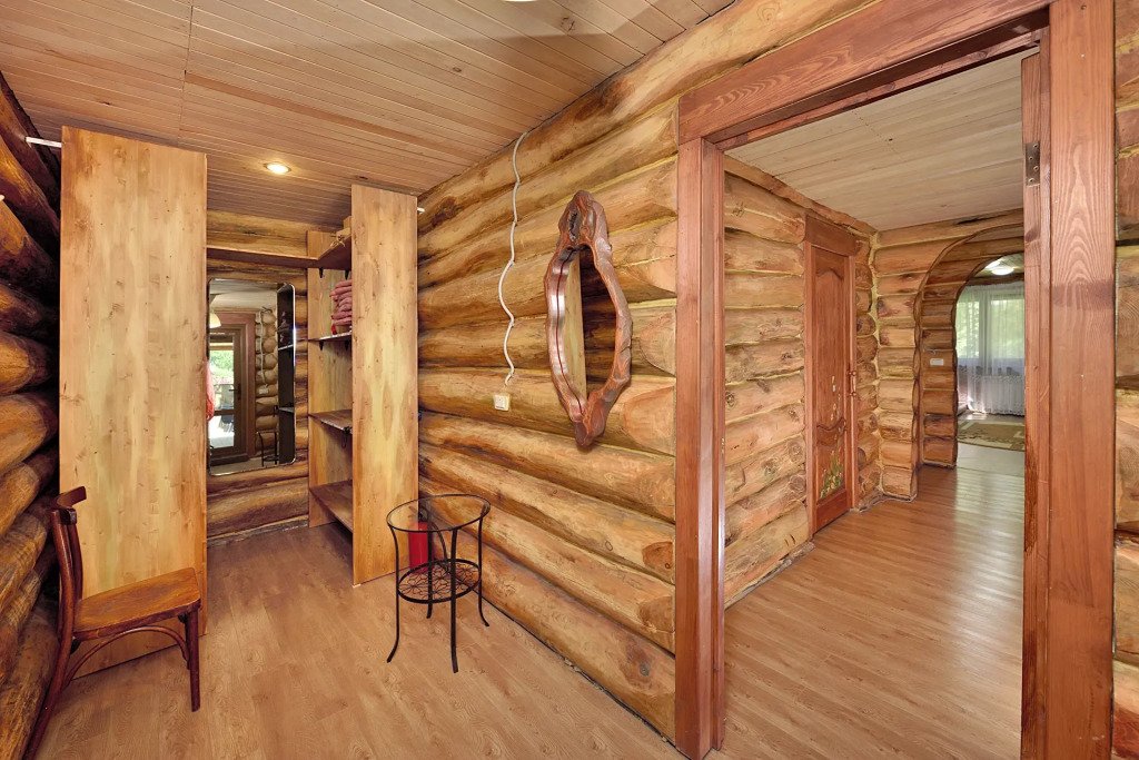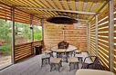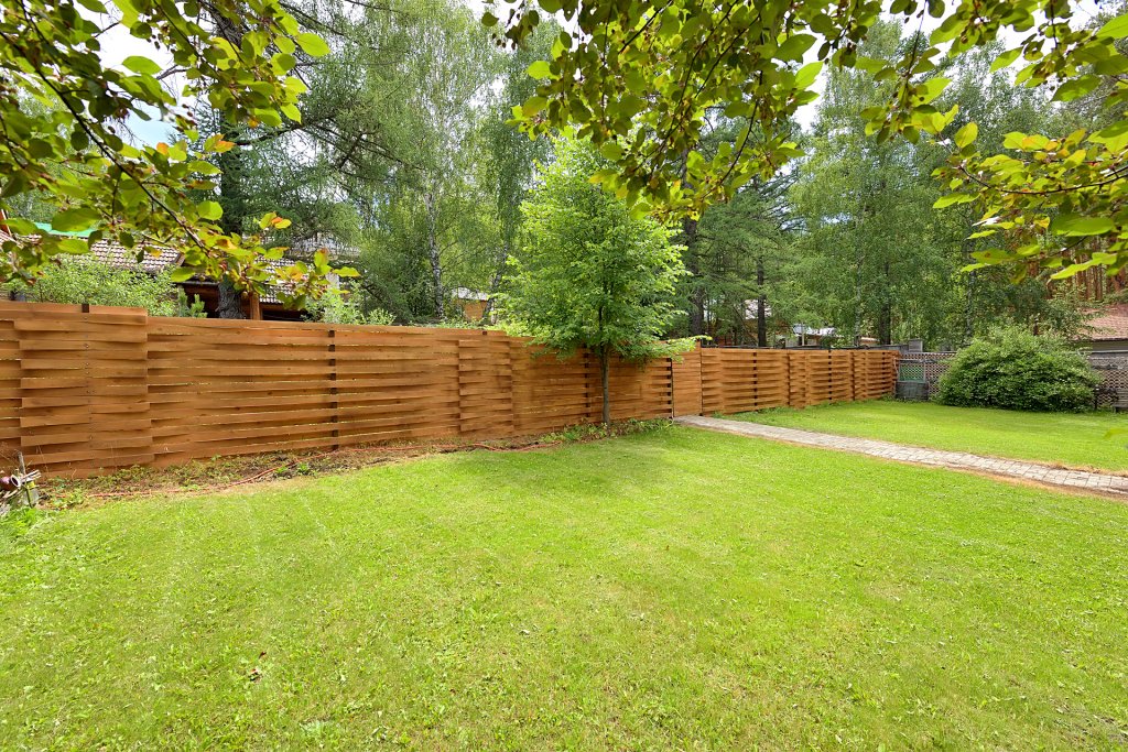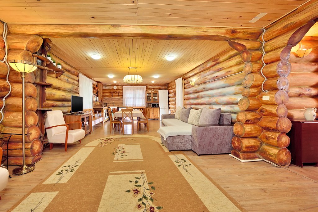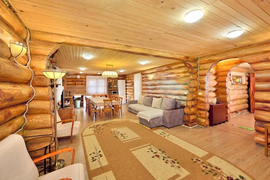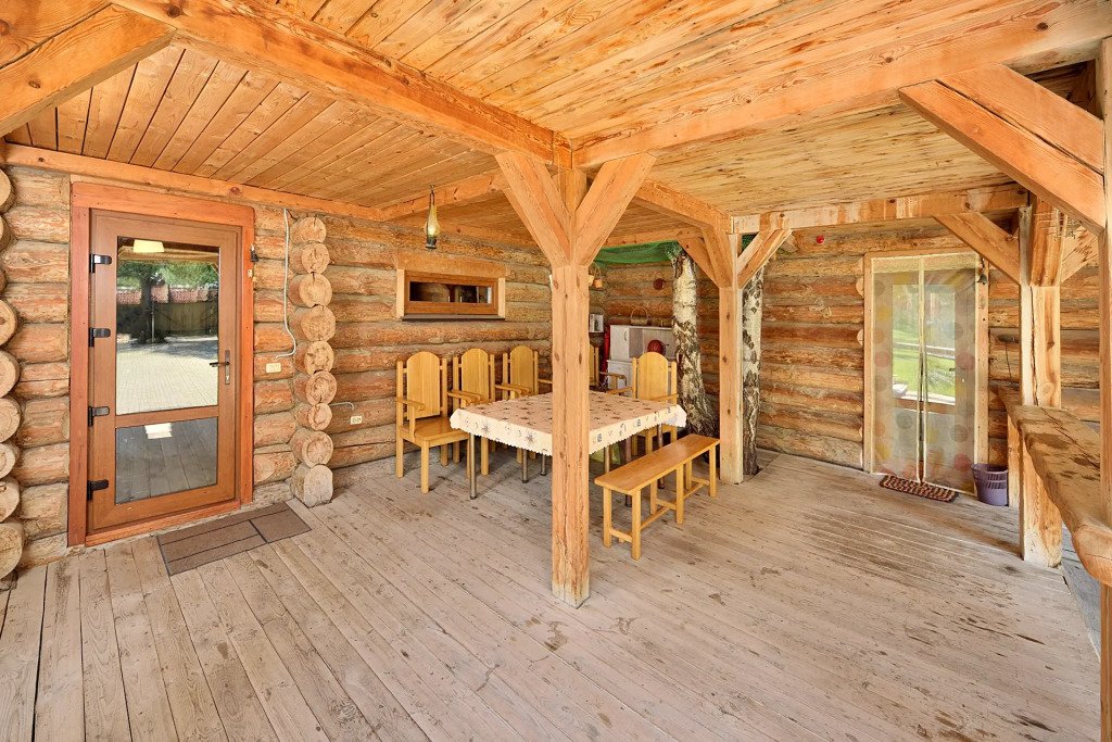 Первый домик (180 кв. м.) рассчитан на 13 человек (9 основных и 4 доп. места). Здесь есть 3 спальни, 3 санузла с душевыми, кухня-гостиная. Территория — 12 соток, парковка на 6 машин, веранда и беседка.