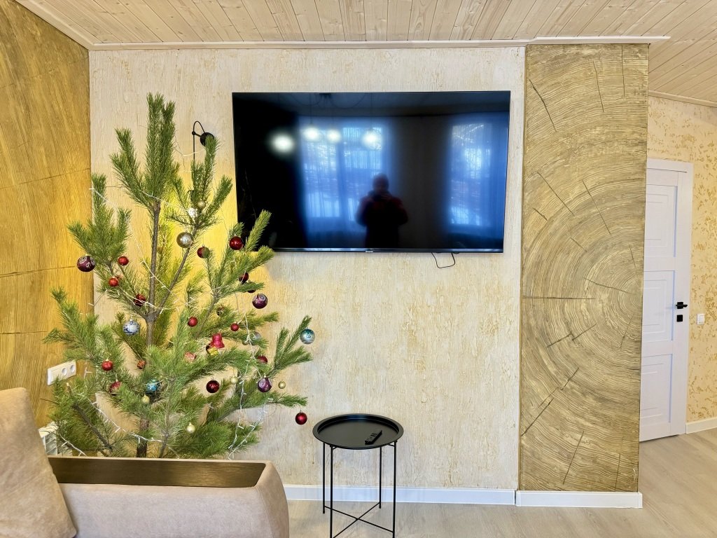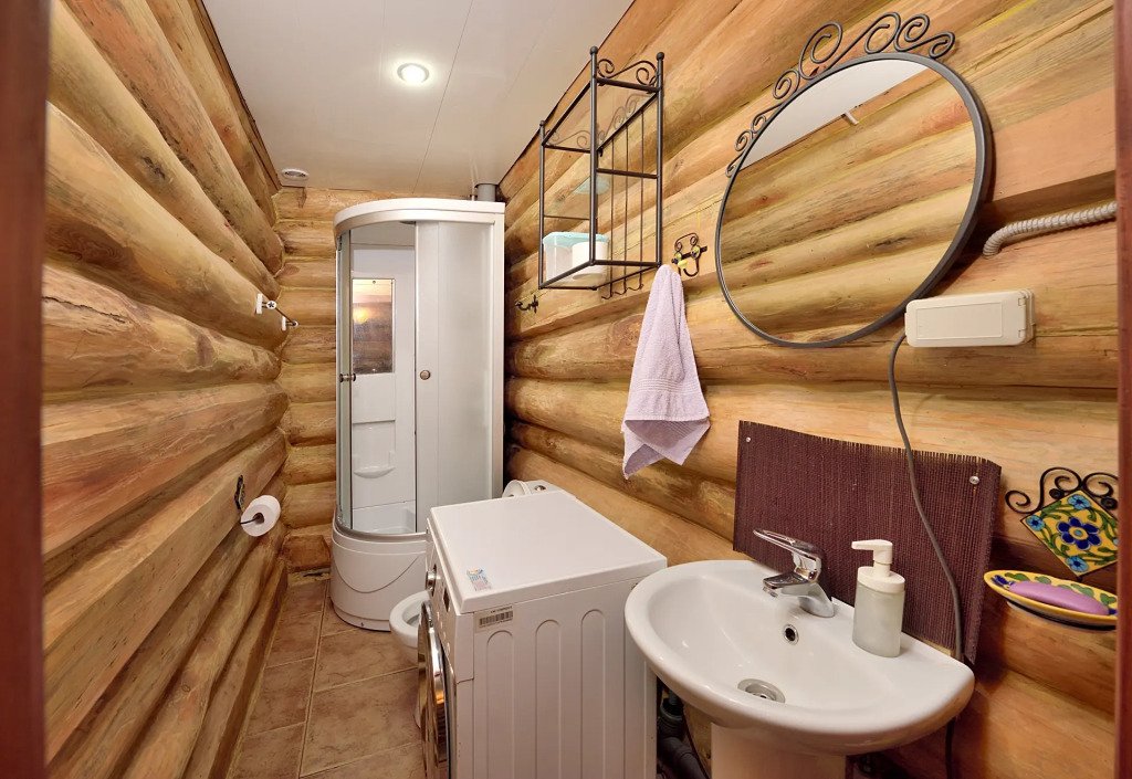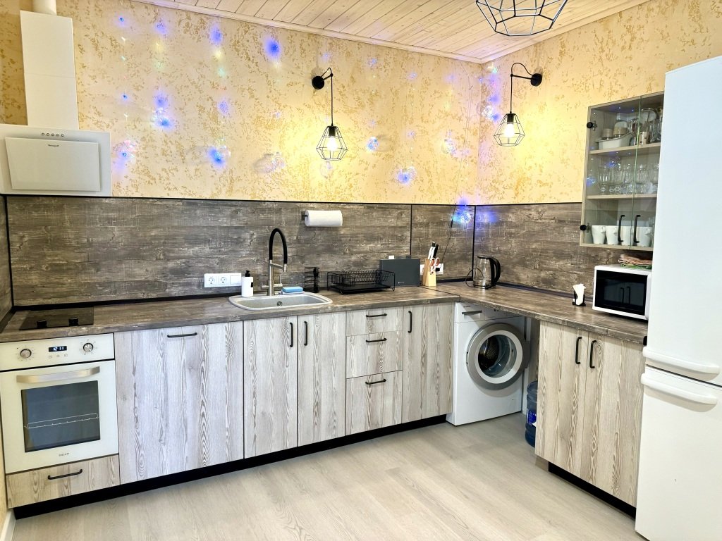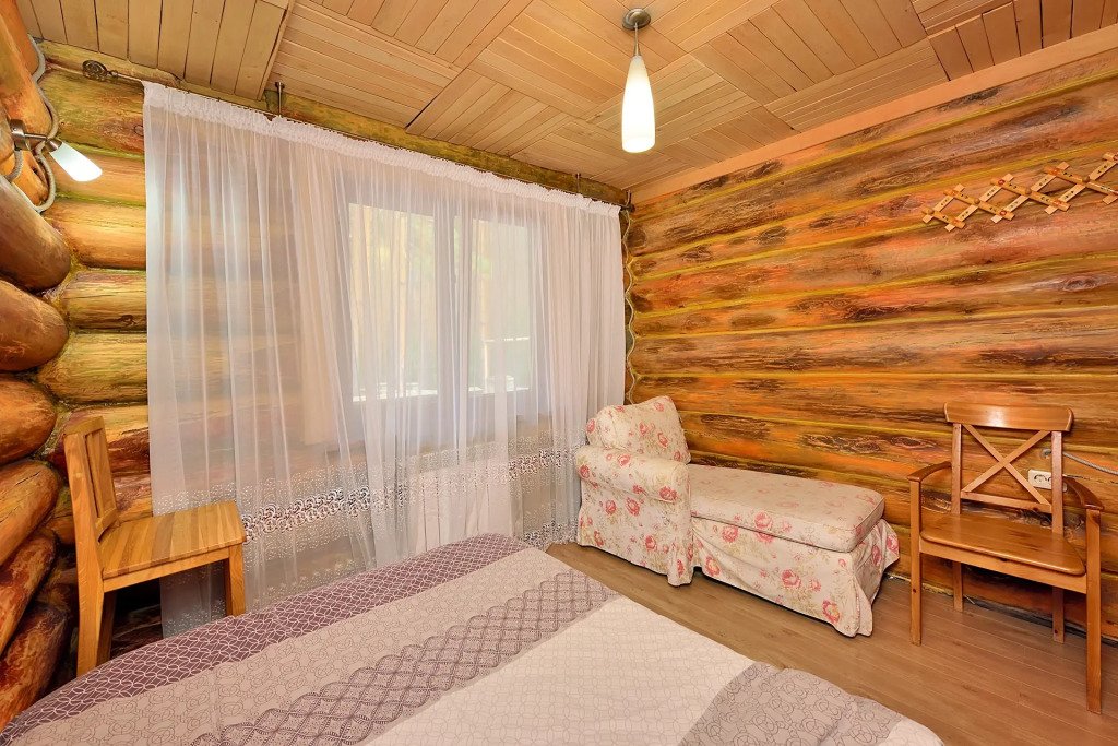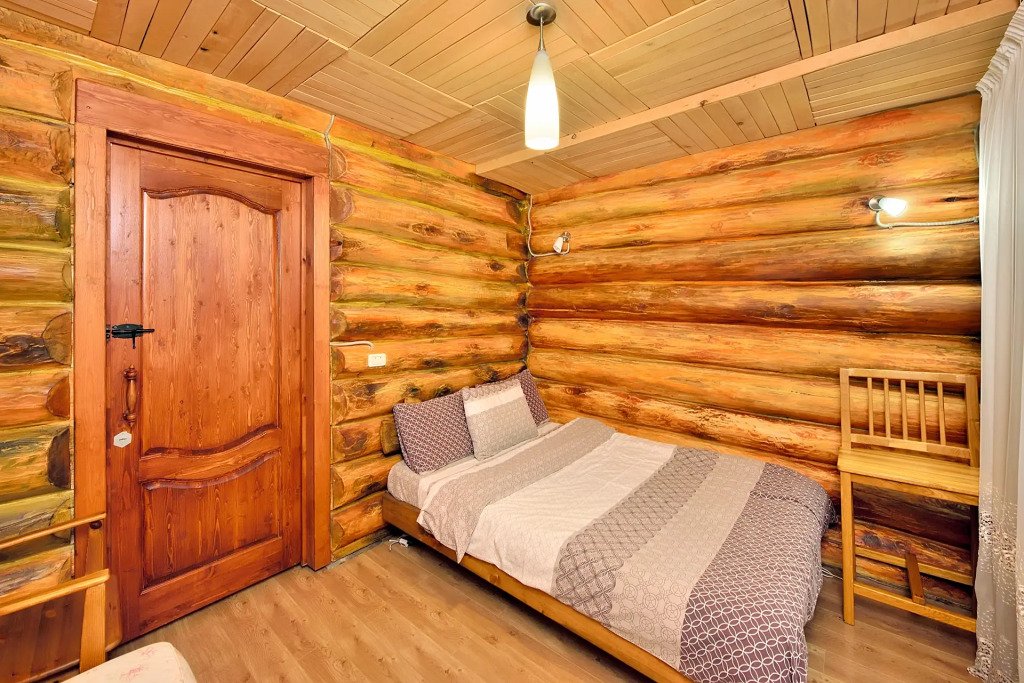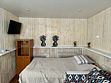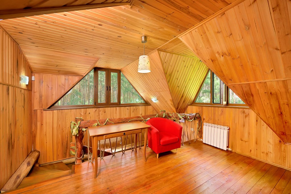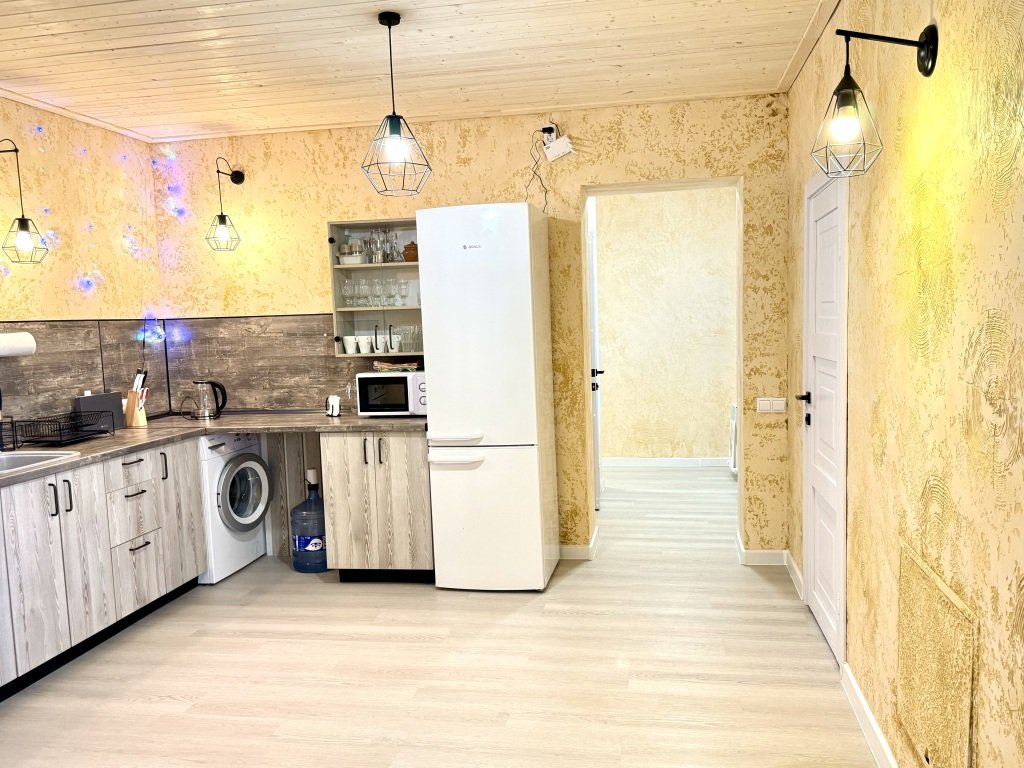 Второй домик (70 кв. м.) с вместимостью до 8 гостей (6 основных и 2 доп. места) имеет 2 спальни, 1 санузел с душевой зоной и кухню-гостиную. Территория — 9 соток, парковка на 3 машины, мангальная зона.