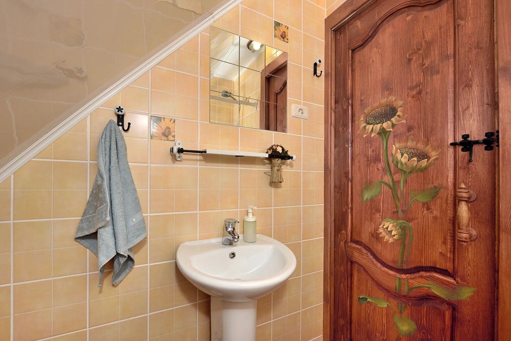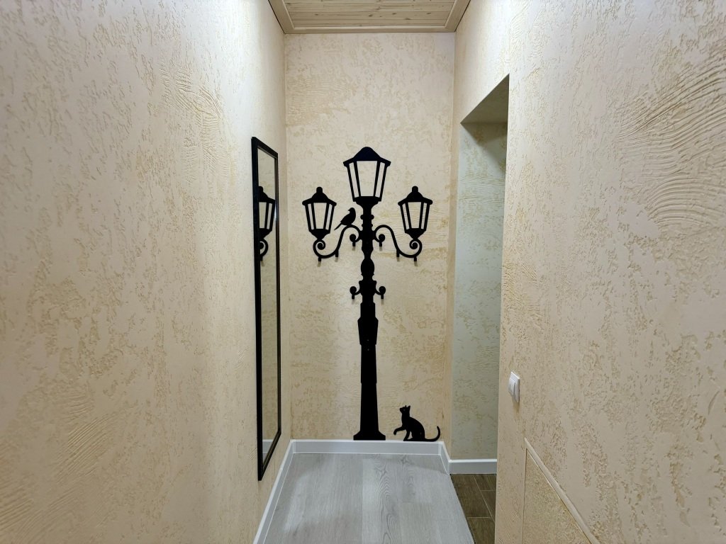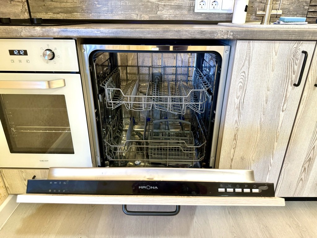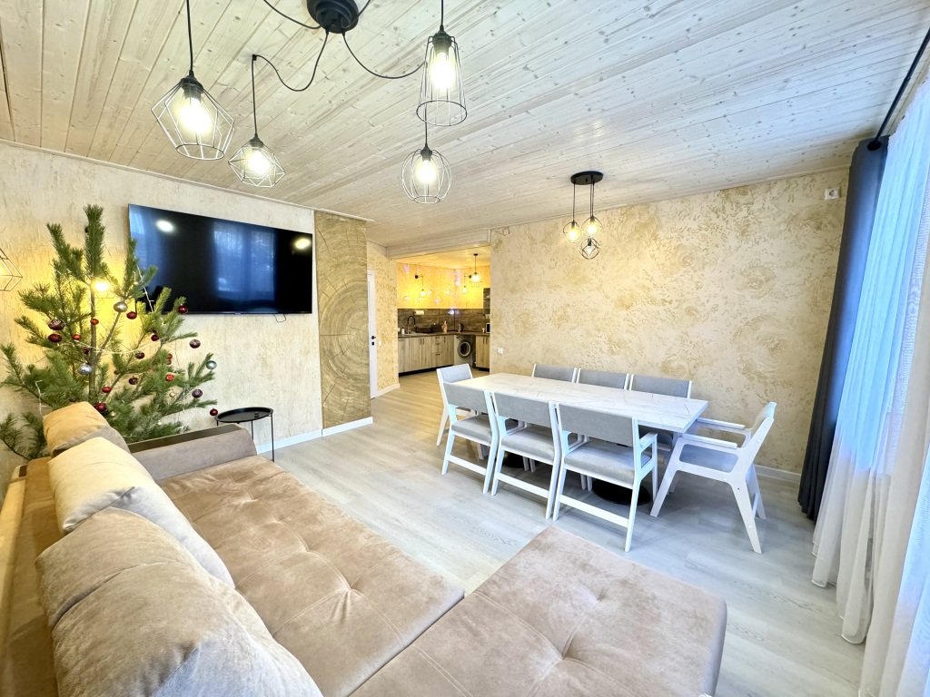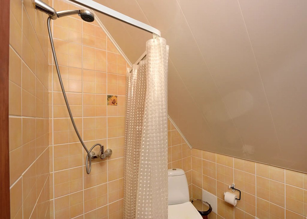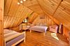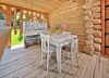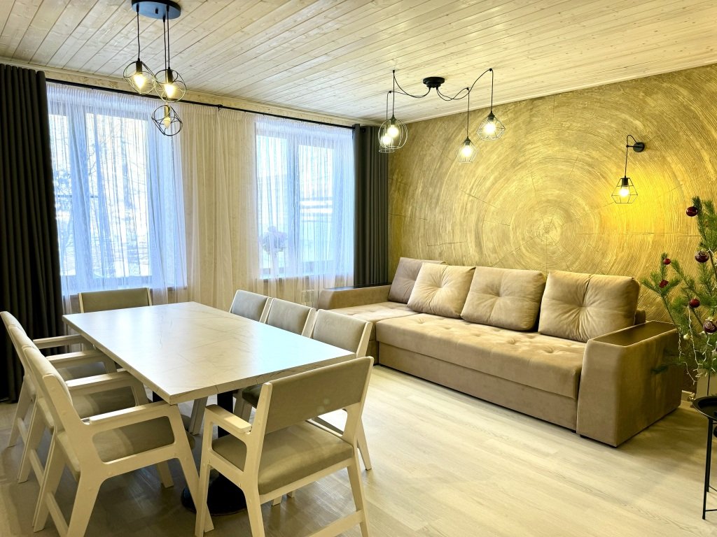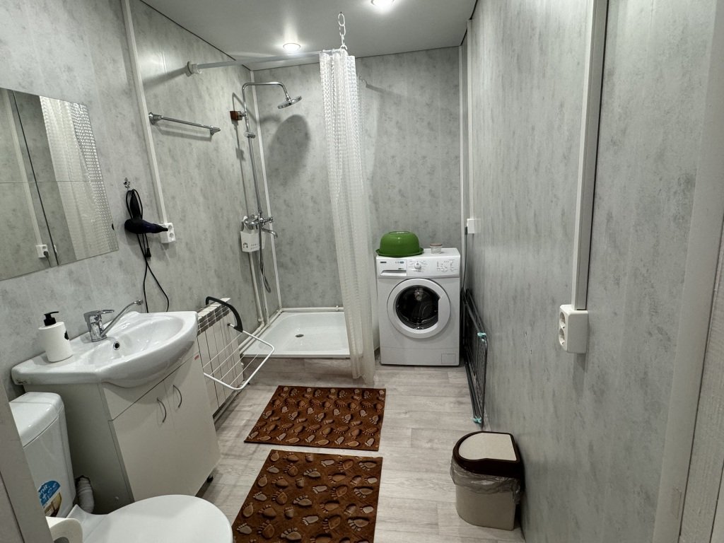 Второй домик (70 кв. м.) с вместимостью до 8 гостей (6 основных и 2 доп. места) имеет 2 спальни, 1 санузел с душевой зоной и кухню-гостиную. Территория — 9 соток, парковка на 3 машины, мангальная зона.