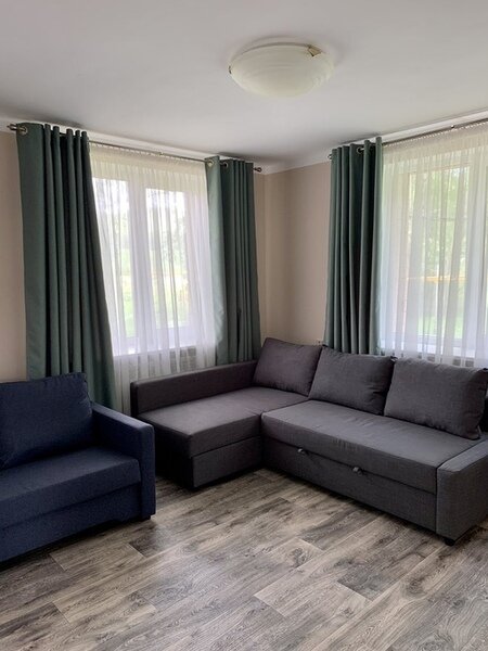 Отдельно стоящий дом вместимость до 10 человек. В номере две спальни с двуспальными кроватями и гостиная с 3 диванами.