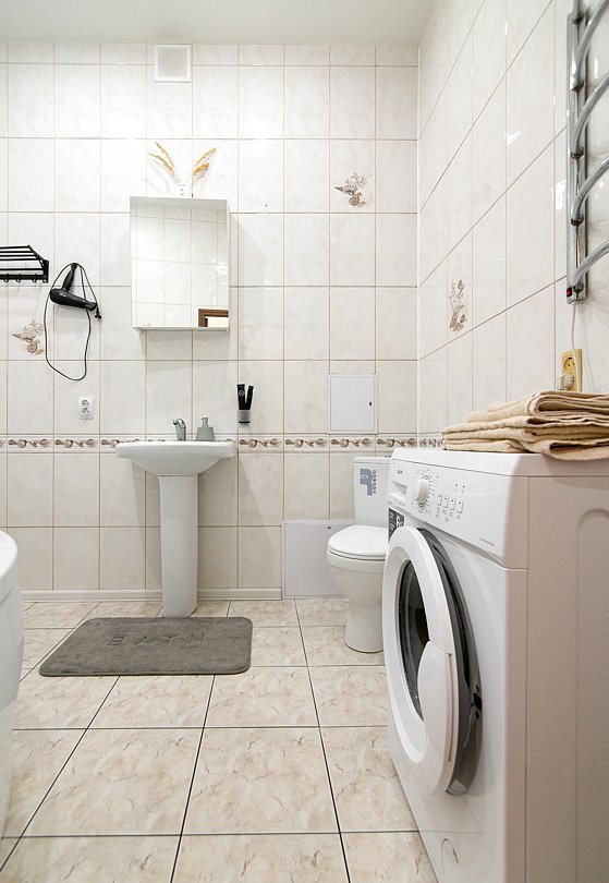 - Стиральная машина, микроволновая печь, фен, утюг, чайник, ТВ + Wi-Fi, духовка, холодильник,