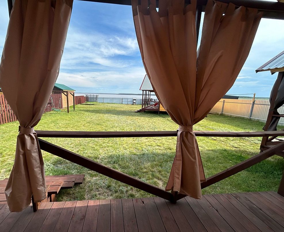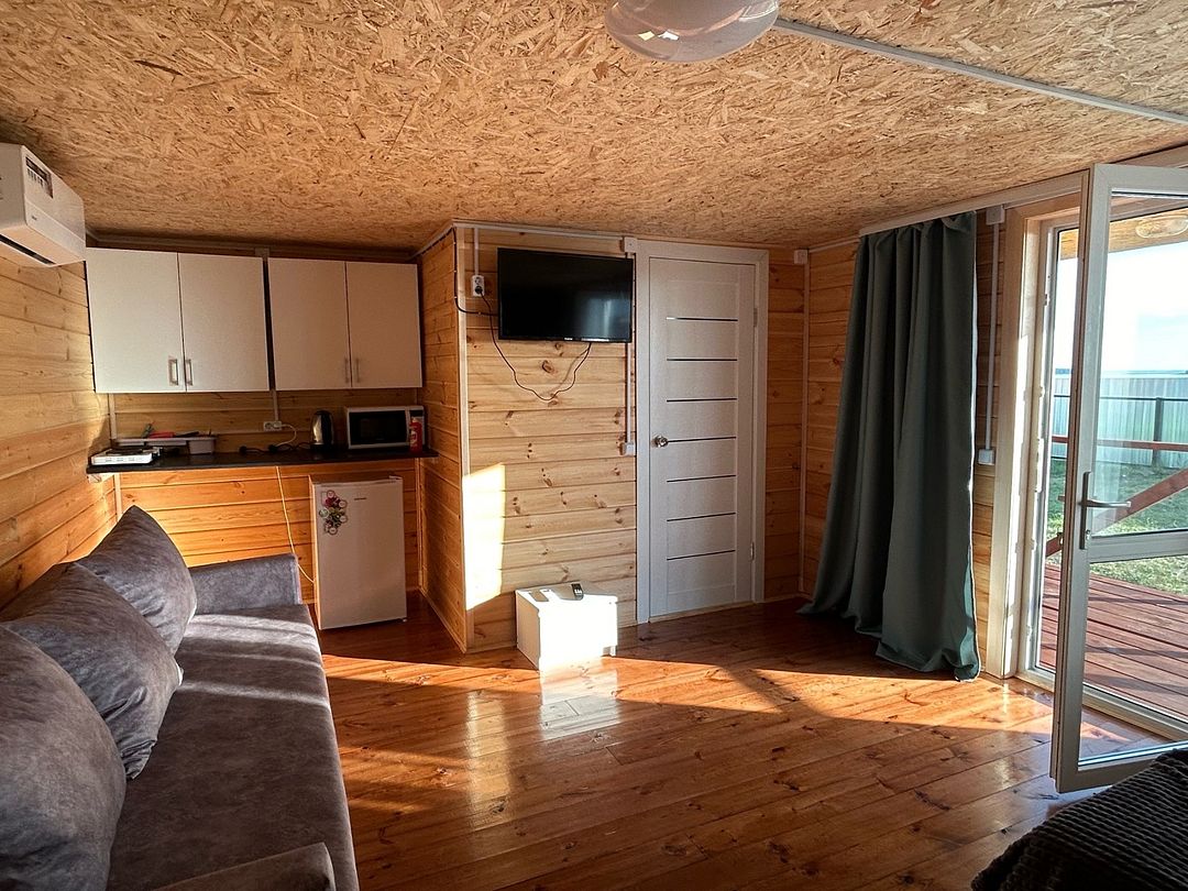 Расположен на первой линии, до соленого озера примерно 50 метров, на территории детская площадка, батут, мангальная зона, своя открытая терраса, мини кухня домике, холодильник, микроволновка, чайник, плитка на 2 конфорки, минимальный набор посуды