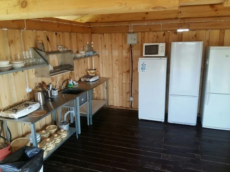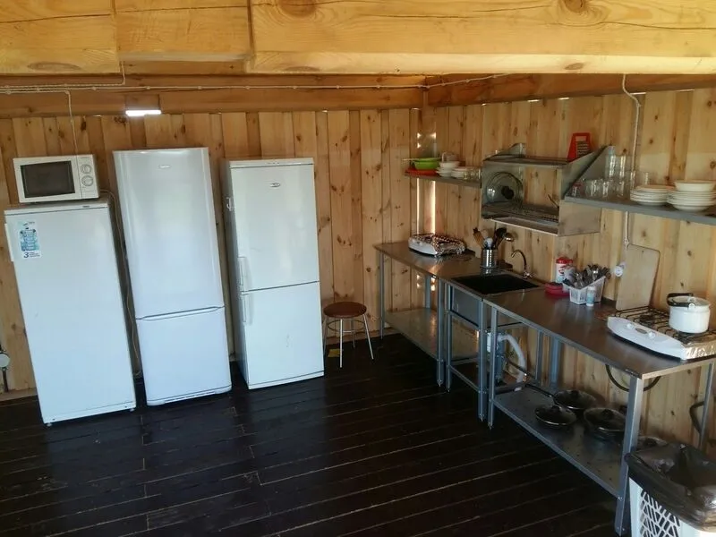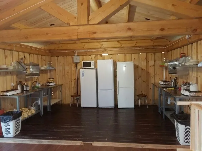 Номер – половина дома. Две односпальные кровати, 2 детских места на полатях (верхние места), тумбочка прикроватная, стол, стулья, шкаф для одежды. Удобства (туалет, душ, кухня-столовая) на территории