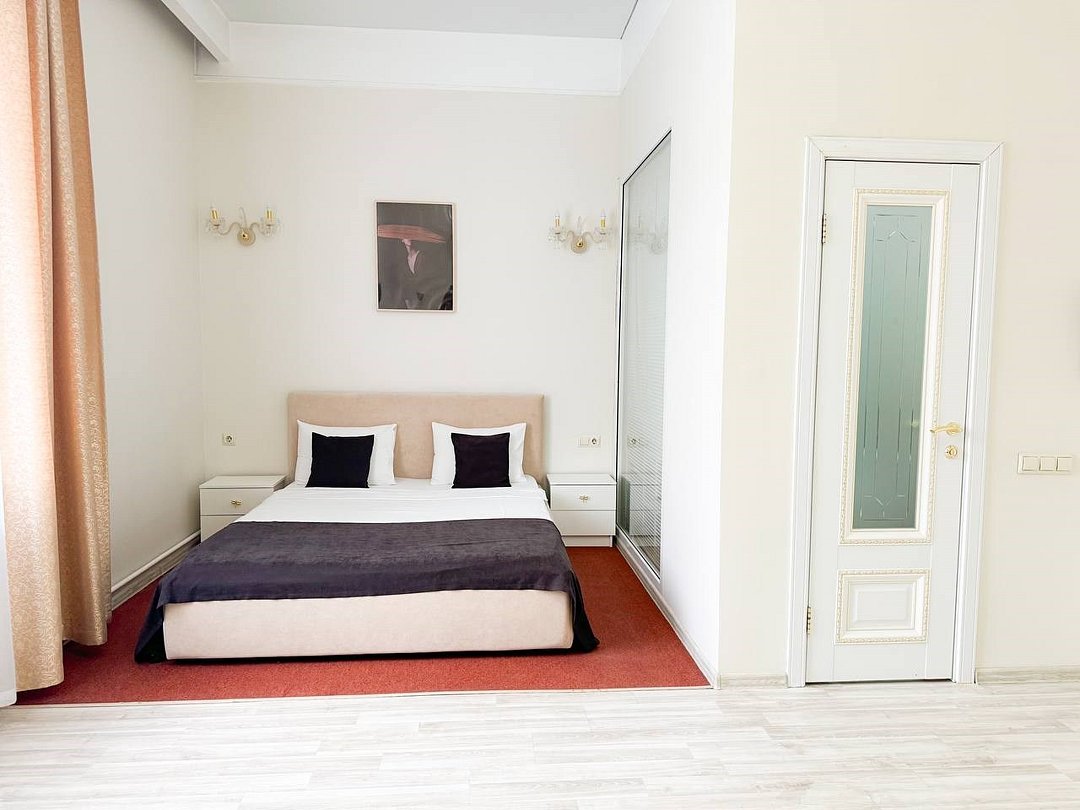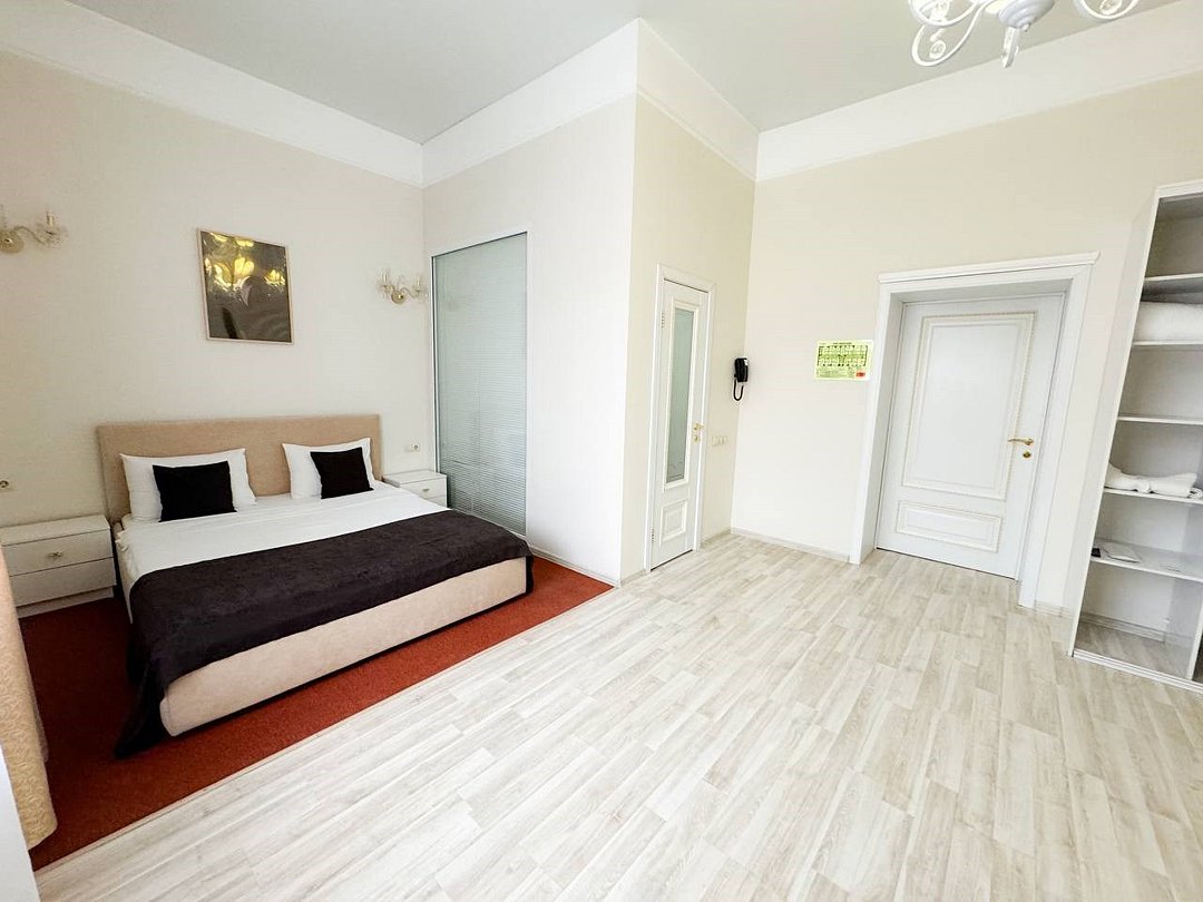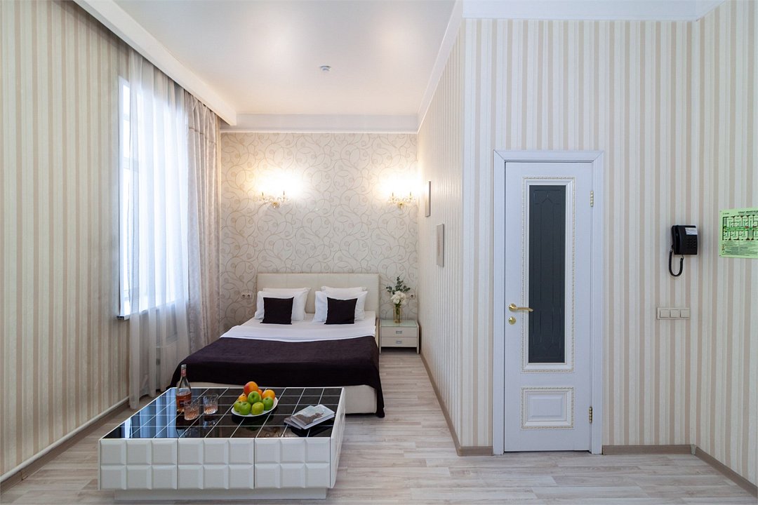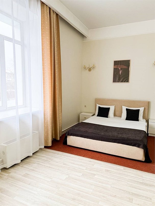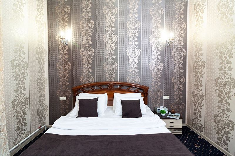 Небольшое трехэтажное здание отеля разместилось в тихом, спокойном дворе. Гостей ожидают 13 комфортабельных двухместных номеров категории Стандарт, Полулюкс, Люкс. В номерах удобная, функциональная мебель светлых оттенков, есть телевизор, фен, мини-холодильник, ванная комната с душевой.