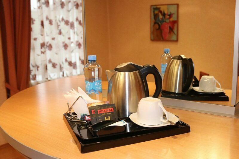 В номерах есть все необходимое. Туалетные принадлежности, халатик, тапочки, телевизор, холодильник и чайник.