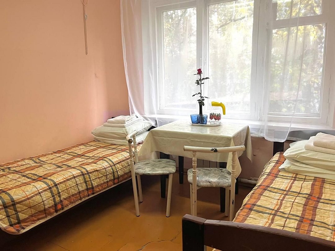 Туалет в номере, душ на этаже. Одна односпальная кровать и одна двухъярусная, стол, 3 табурета, 3 тумбочки, шкаф с полками, поднос, графин, 3 стакана, зеркало в санузле, вешалка настенная.