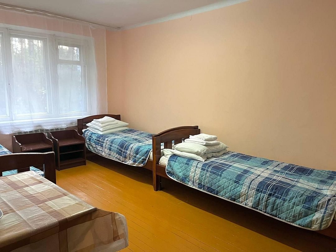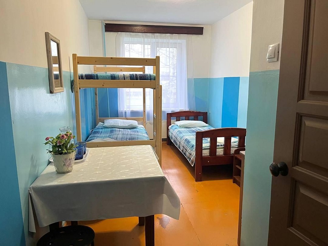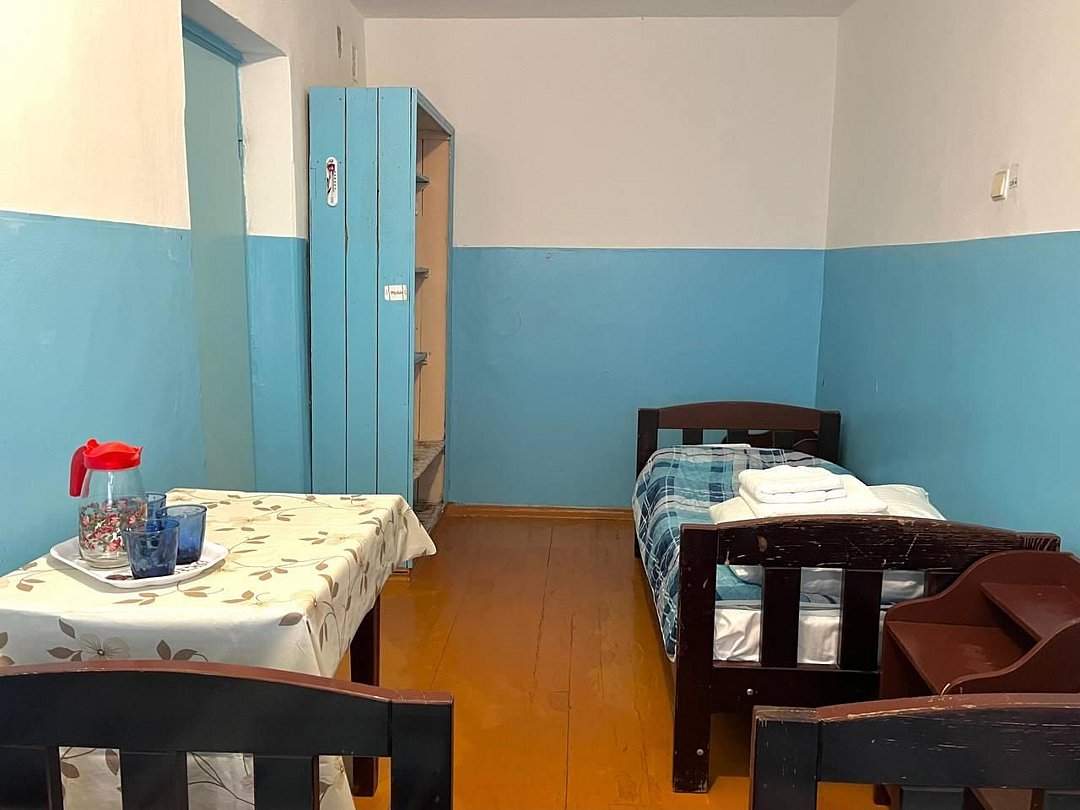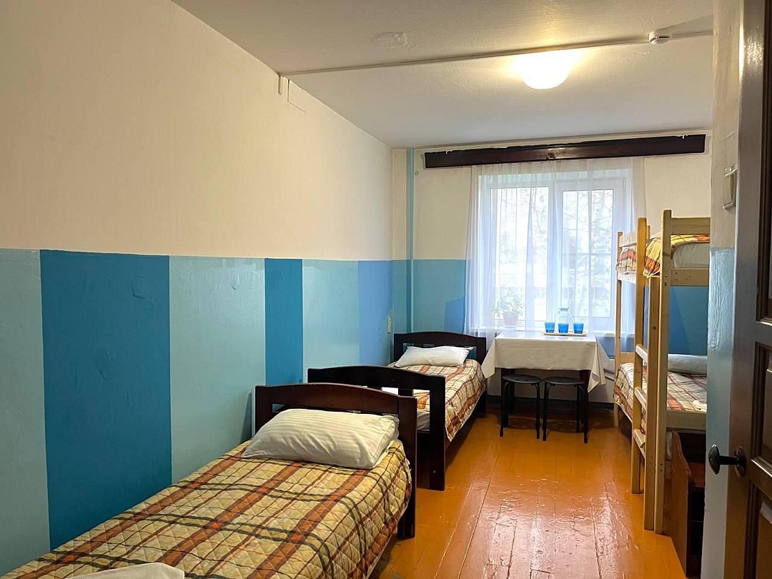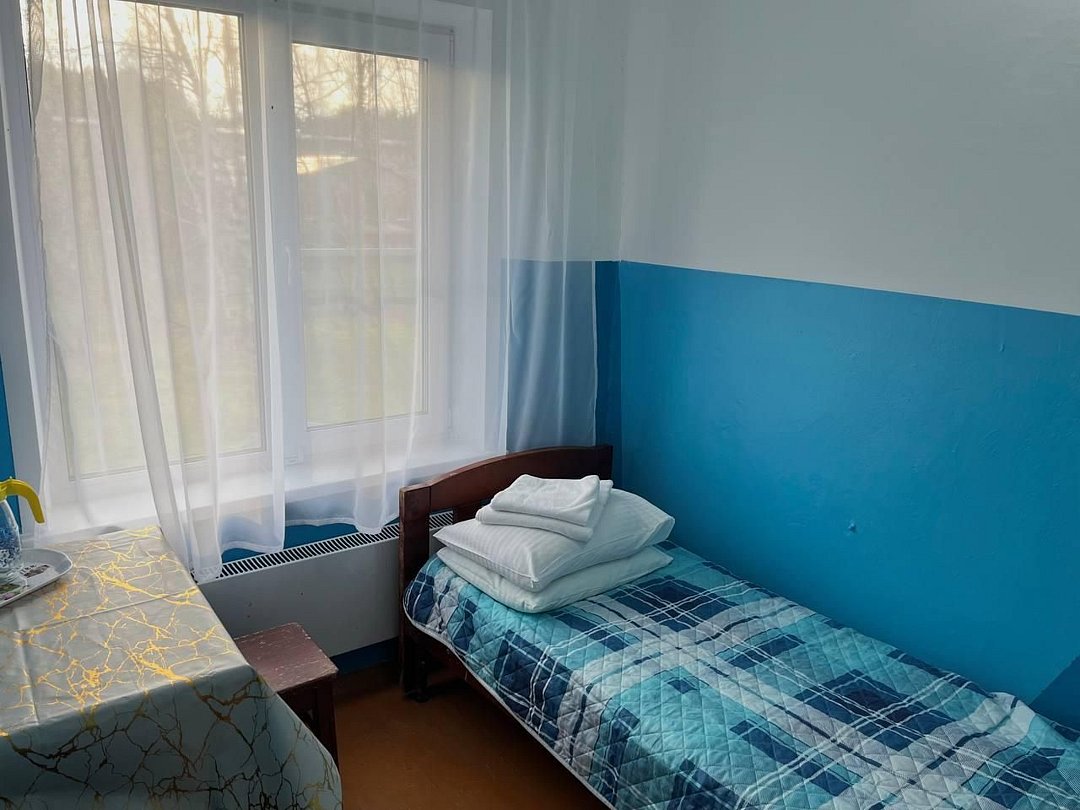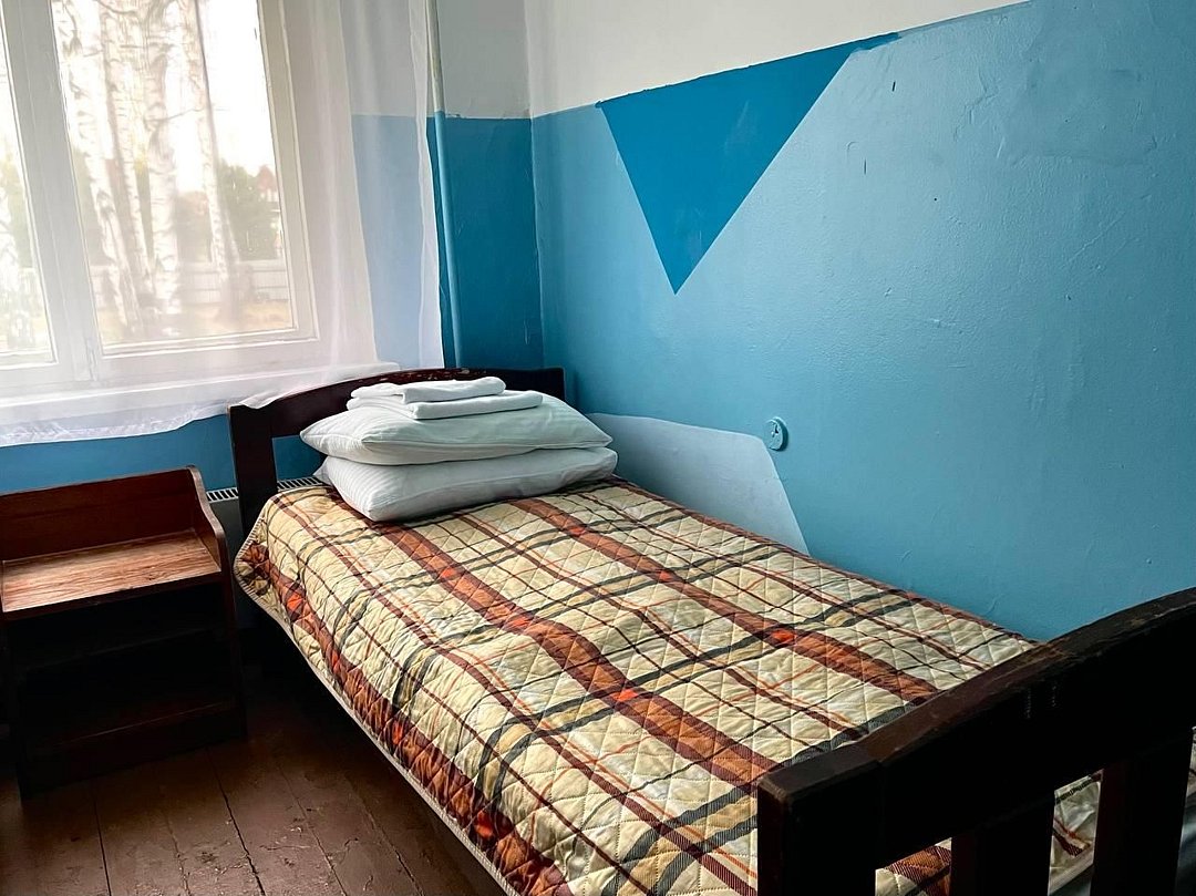 В номере одна односпальная кровать и одна двухъярусная, стол, табуреты и тумбочки по количеству кроватей, шкаф с полками, вешалка настенная. Туалет и душ на этаже.
