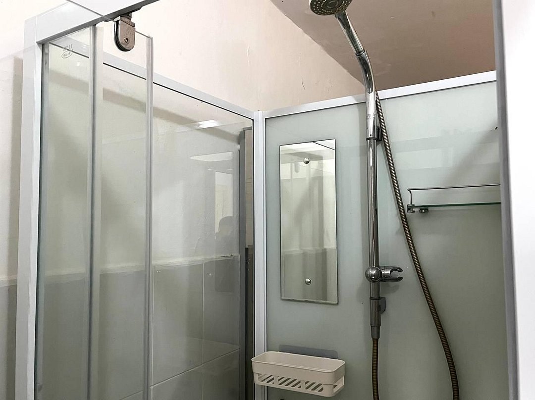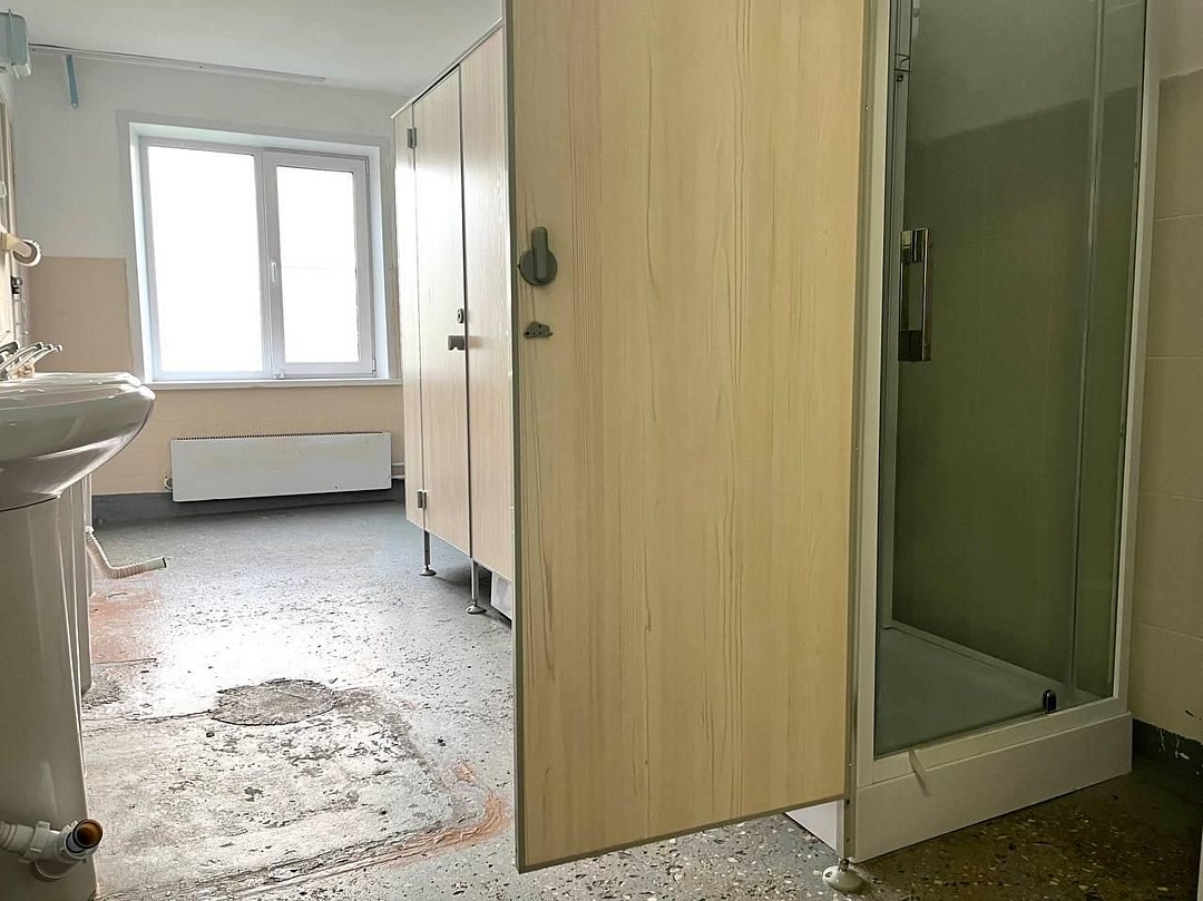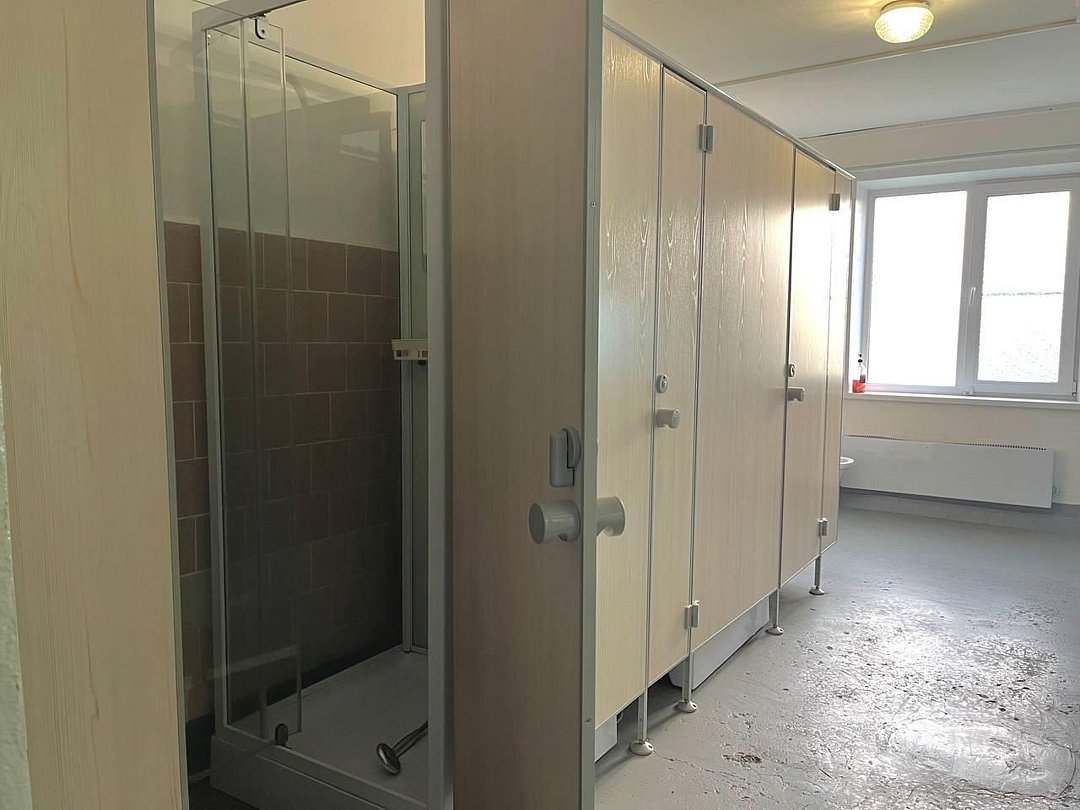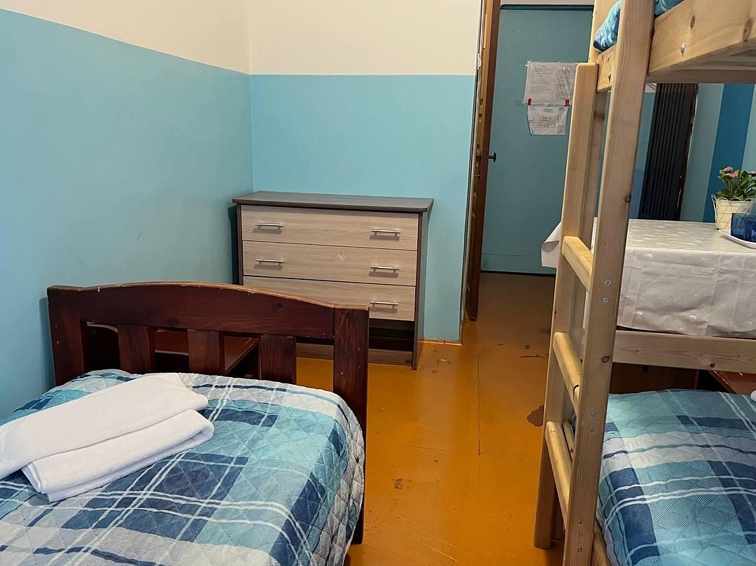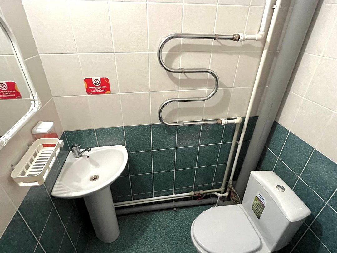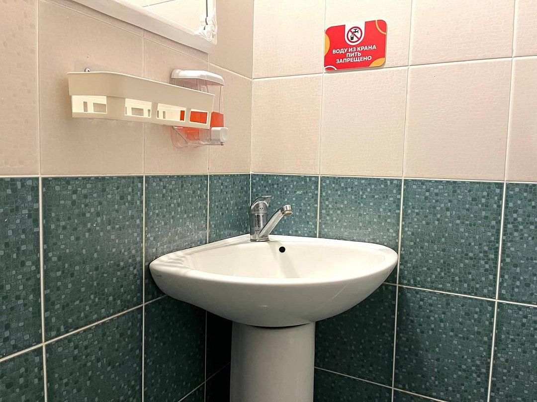 В номере унитаз и раковина, душевая на этаже. Две односпальные кровати и одна двухъярусная, стол, 4 табурета, 4 тумбочки, шкаф с полками/комод, поднос, графин, 4 стакана, зеркало в санузле, вешалка настенная.