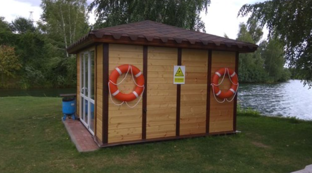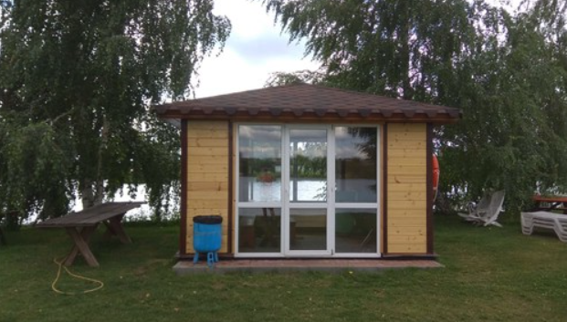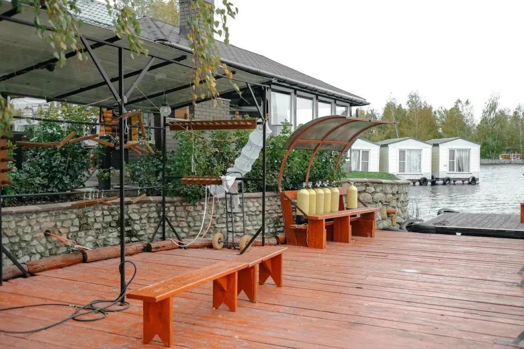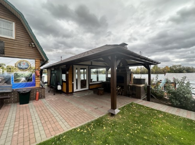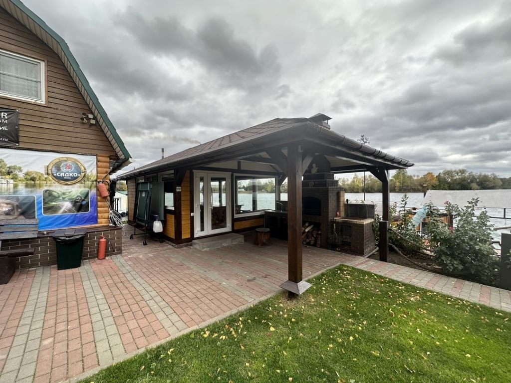 Беседка вмещает до 25 человек. Для проведения праздников на природе у воды. В ней холодильник, термоподъемник, кулер с питьевой водой. Рядом мануальная зона, пляж шезлонги.