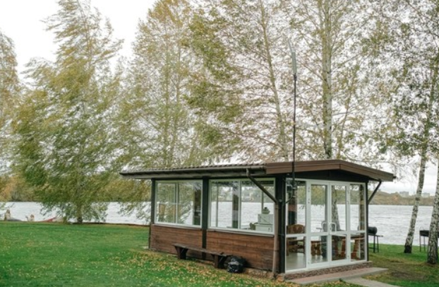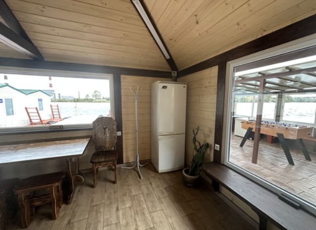 Беседка №6 с отоплением, кондиционером, панорамным окном с видом на озеро, так же имеется холодильник,телевизор, караоке, бойлер и мангальгая зона. Беседка рассчитана до 20 человек.