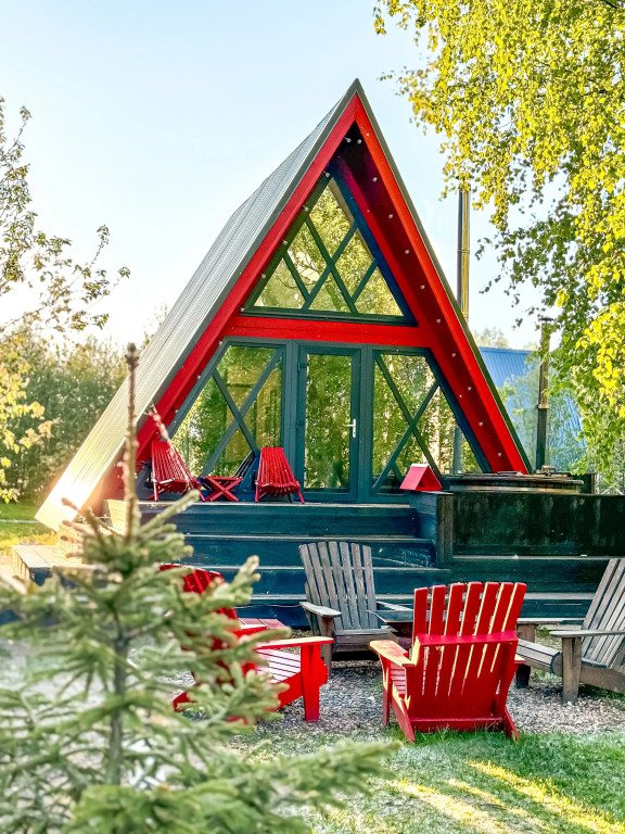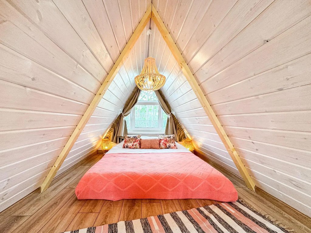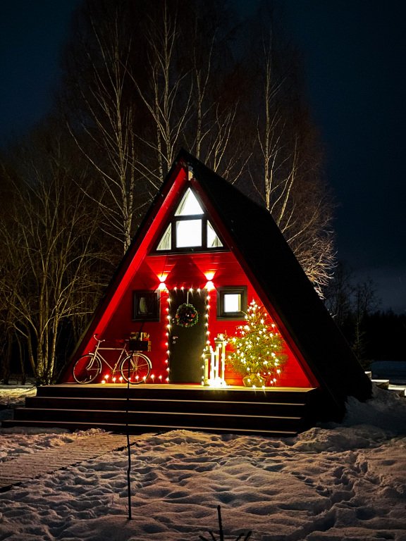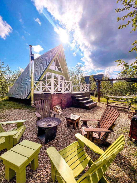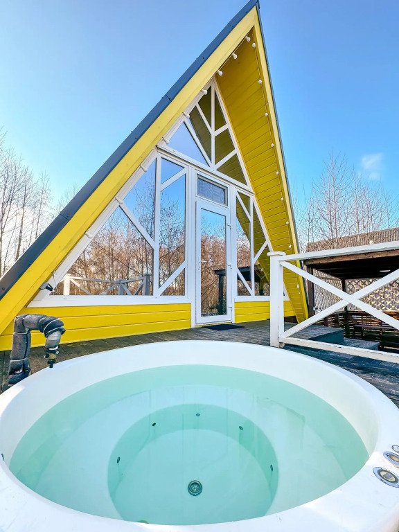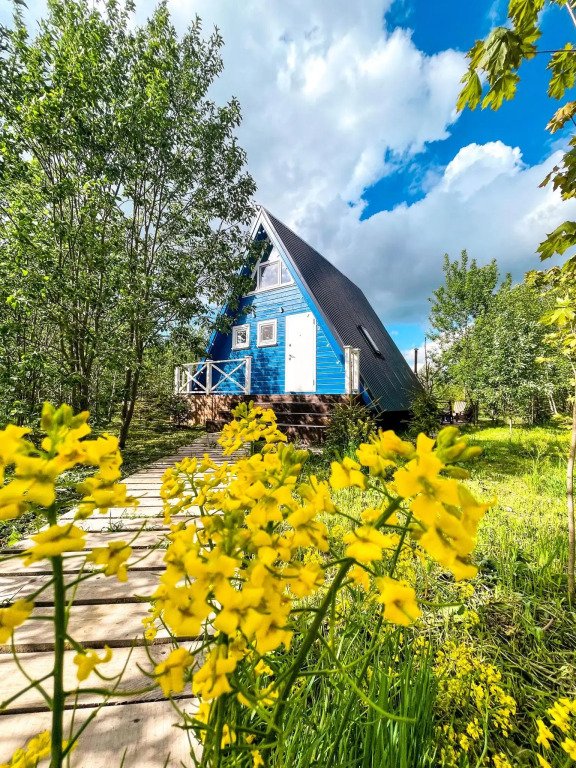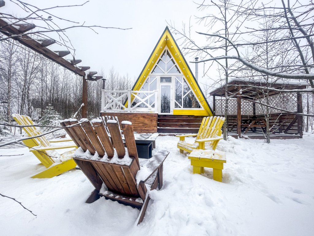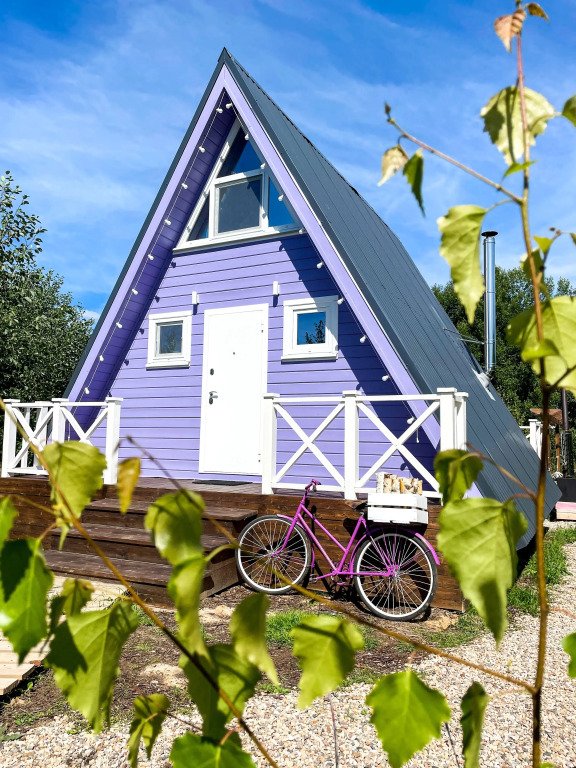 На территории в 1,5 гектара расположился уникальный комплекс для отдыха круглый год: 9 треугольных А-фрейм домов и 4 современных этнодомика в русском стиле, стоящие прямо у воды. Каждый дом отличается цветом и уникальным интерьером.