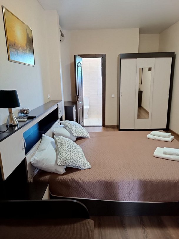 Номер двухкомнатный, вместимостью до 3 человек. Возможно доп. место. В номере санузел, кондиционер, телевизор, шкаф, туалетный столик, комод, кровати.