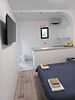 Санузел, душевая кабина, кровати, шкаф, тумбочки, комод, холодильник, спутниковое телевидение, кондиционер (сплит-система), WiFi, большой балкон с зоной отдыха и видом на море.