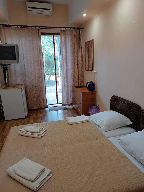 В номере санузел, душевая кабина, кровати, шкаф, тумбочки, комод, спутниковое телевидение, кондиционер (сплит-система), WiFi. Большой балкон с зоной отдыха и видом на море.
