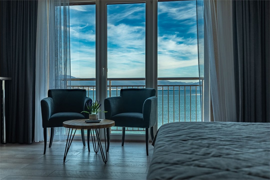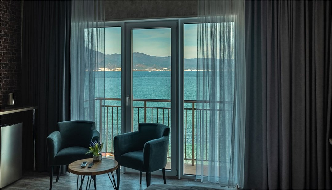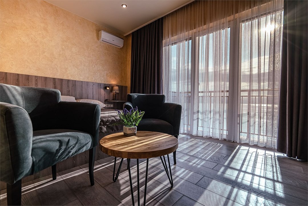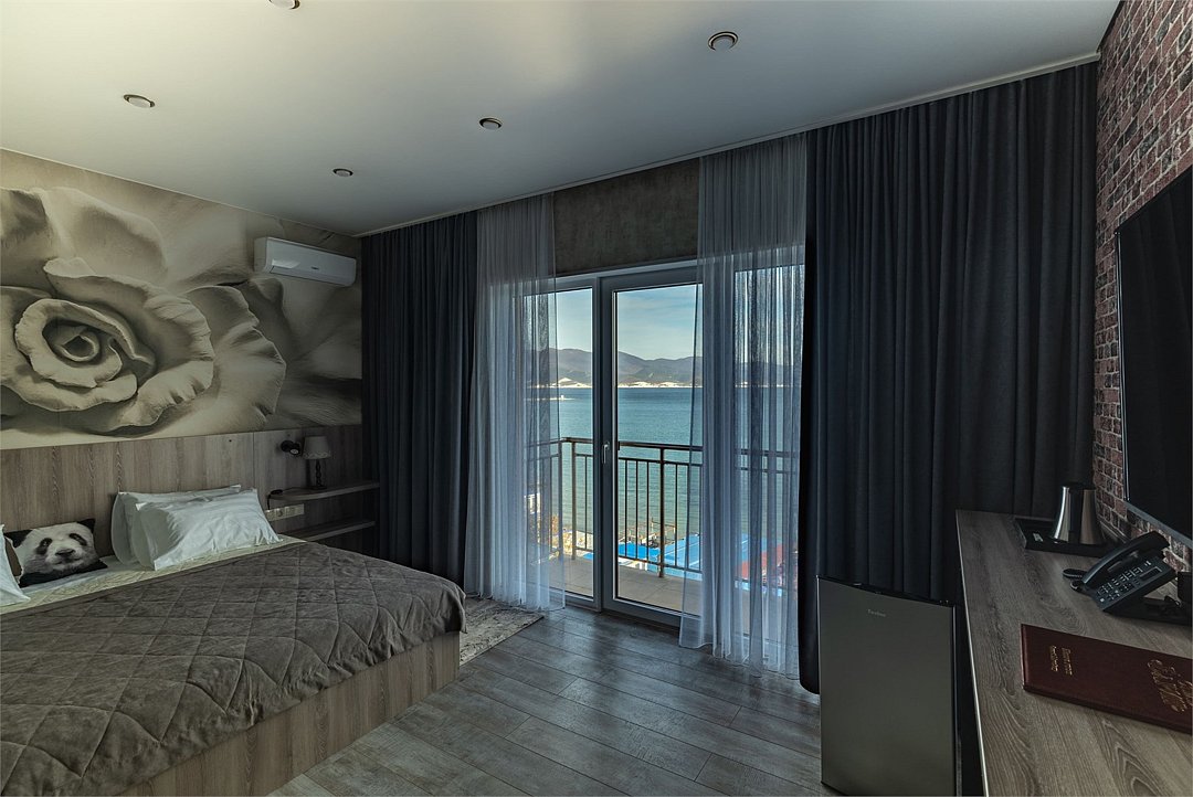 Улучшенный номер с балконом и шикарным видом на море и горы. В уютном номере есть все необходимое для отдыха в комфортных условиях: большая кровать, сейф, ЖК-ТВ, холодильник, чайная станция, ванная с теплым полом.Услуги и удобства
