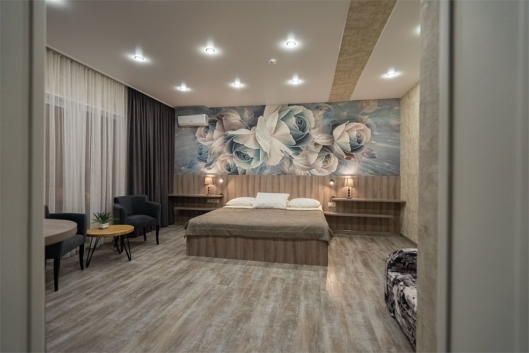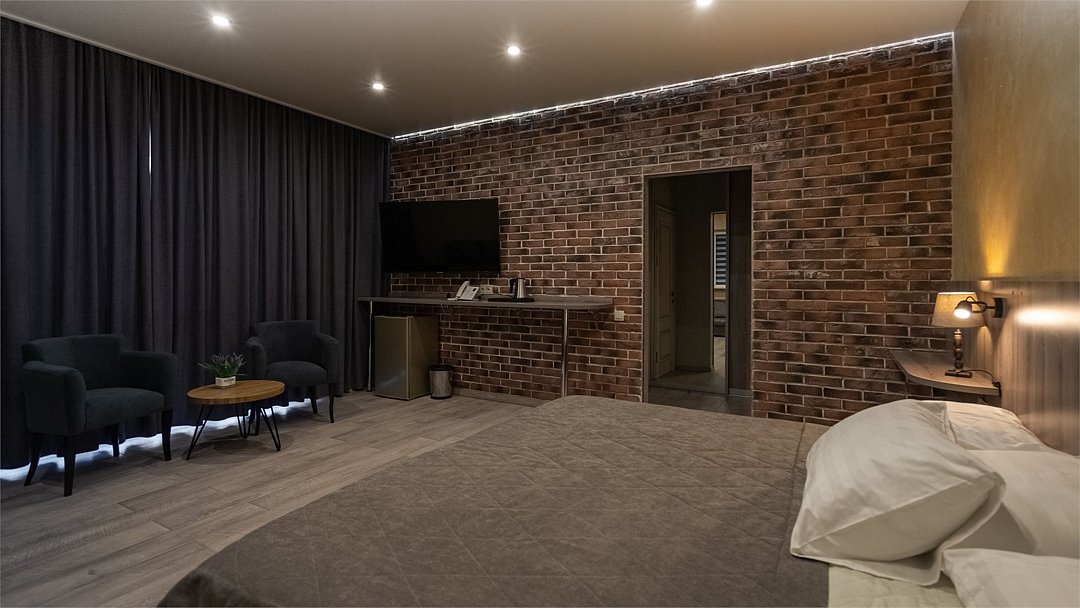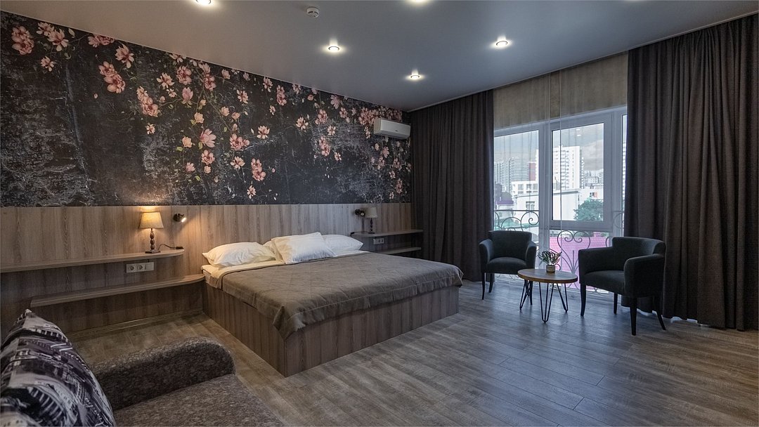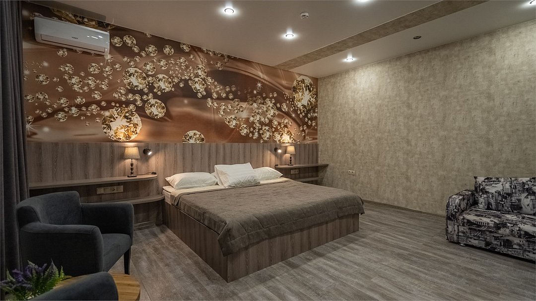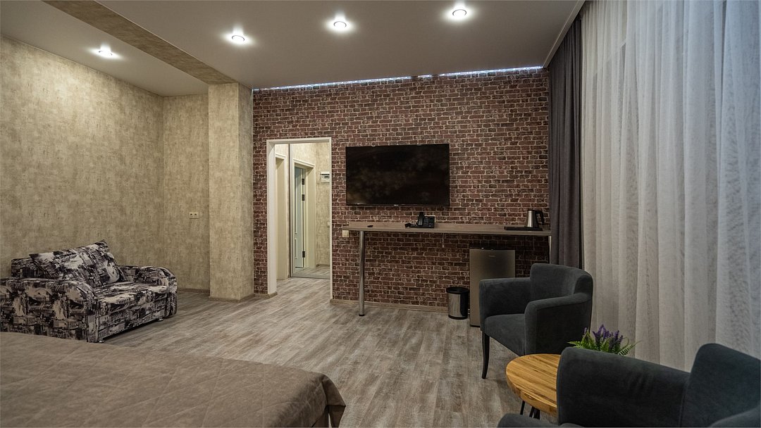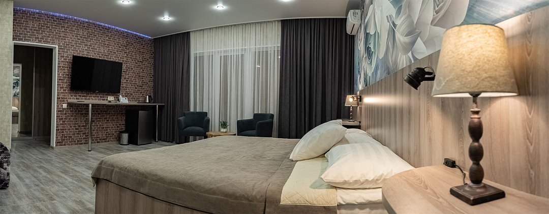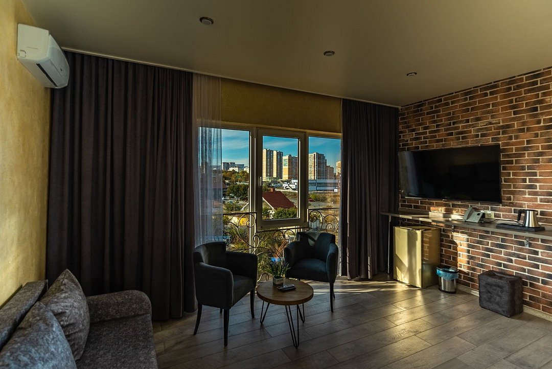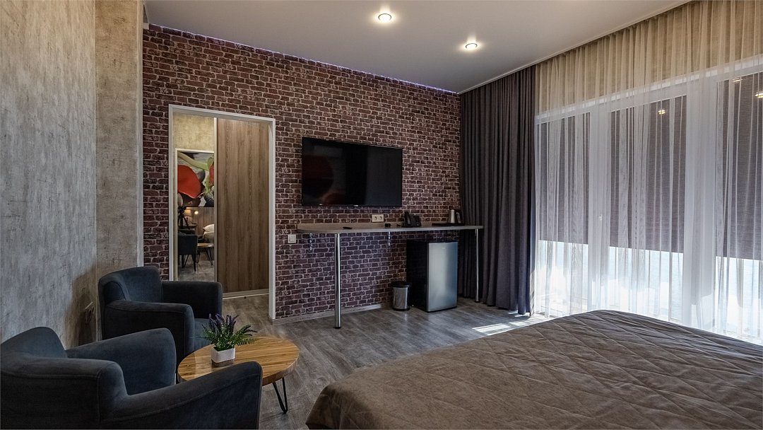 Улучшенный номер с видом на город без балкона. В просторном номере с уютной зоной отдыха есть все необходимое для вашего проживания в комфортных условиях: большая кровать, сейф, ЖК-ТВ, холодильник, чайная станция, ванная комната.Услуги и удобства