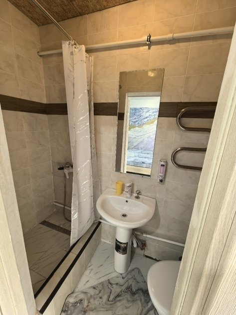 К вашему вниманию номер-эконом на 2-м этаже. Все условия для комфортного проживания: кондиционер, мебель, вся бытовая кухонная техника, Wi-Fi. В номере свой холодильник, чайник, посуда. Ванная комната на 3 двухместных номера на 1-м этаже. В каждом номере максиму 2 человека. Предоставляются ванные принадлежности, тапочки. Вода горячая и холодная круглосуточно. Номер закрывается на ключ.