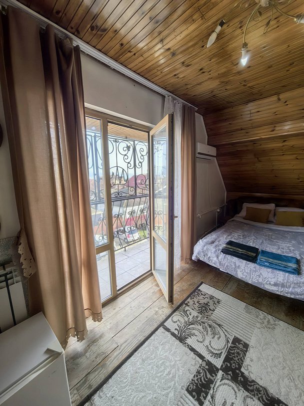 К вашему вниманию номер-эконом. Все условия для комфортного проживания: кондиционер, мебель, вся бытовая кухонная техника, Wi-Fi. В номере свой холодильник, чайник, посуда. Ванная комната на 3 двухместных номера на 1-м этаже. В каждом номере максиму 2 человека. Номер расположен на 3-м этаже. В номере балкон с видом на море и горы. Предоставляются ванные принадлежности, тапочки. Вода горячая и холодная круглосуточно. Номер закрывается на ключ.