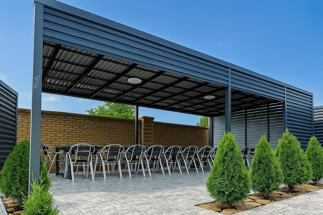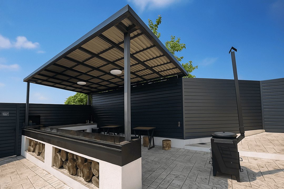 стулья, стол, мангал, навес, веранда, бассейнВ шатре
