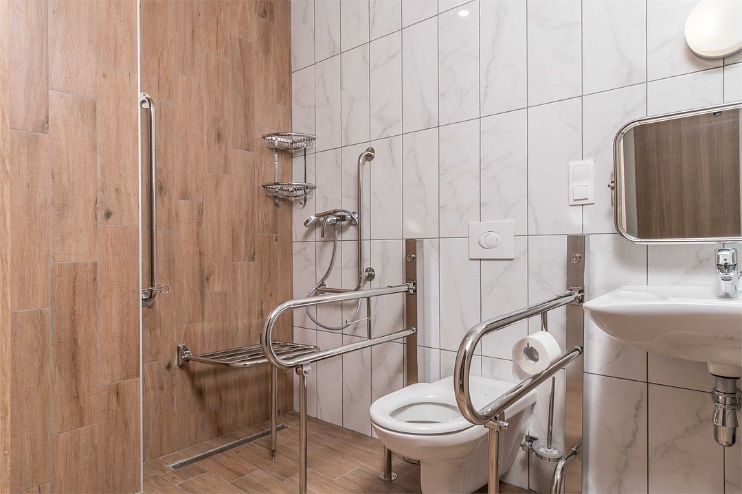 - Специально оборудованная ванная комната дополнительными поручнями