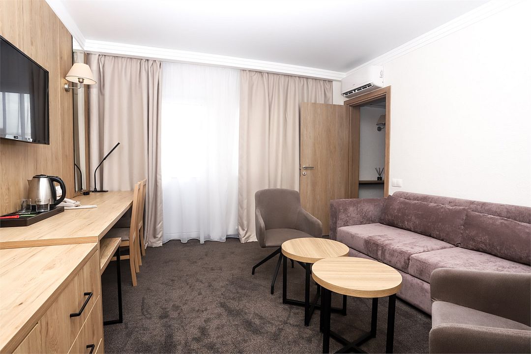 Номер Люкс в отеле предназначен для людей, желающих отдыхать с высоким уровнем комфорта. Люкс (LUX) — комфортабельный двухкомнатный номер для двух человек с гостиной и спальней. В номере есть двухспальная кровать, мягкая мебель для отдыха, шкаф-купе, 2 телевизора с пакетом спутниковых каналов, собственный уединенный балкон с видом на море. Есть возможность дополнительного размещения. Ванная комната оснащена: ванной, душевой кабиной, феном, набором косметических принадлежностей, халатами и тапочками, санузел, дополнительный санузел.Услуги и удобства