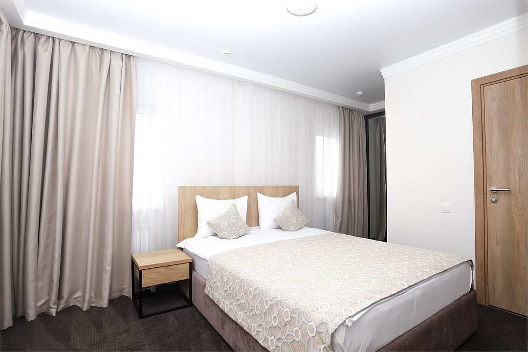 О НОМЕРЕ: Однокомнатный 2-х местный номер с большой двухспальной кроватью или 2 раздельные кровати Площадь номера 16 кв.м В НОМЕРЕ: Сплит система ТВ Телефон FREE WI-FI ZONE Фен Сейф Ванная комната оборудована душевой, для гостей приготовлены: комплект личных принадлежностей Махровые полотенца, Косметические средства (Чайный набор и халаты предоставляются по запросу)Услуги и удобства