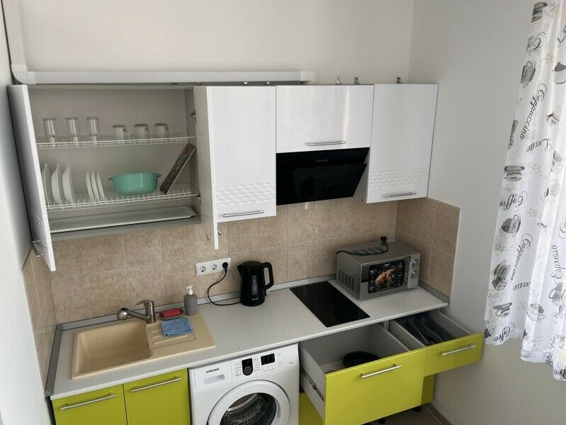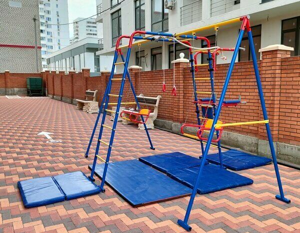 Во дворе площадка мелковата - пара качелей (почему-то высоких), лазилка и турник. Больше во дворе ничего нет. Море - коса, минут 5-7 пешком. Недалеко большой магнит, додопицца, недалеко ситилинк. Интернет хороший, яндекс такси приезжает быстро и с креслами, доставка еды есть, как будто обратно в Москву попал.