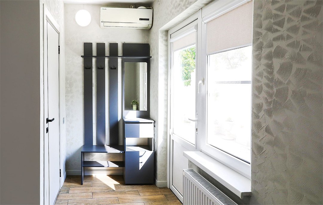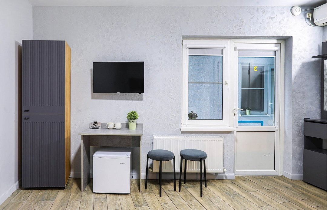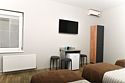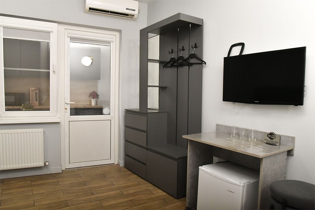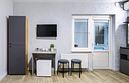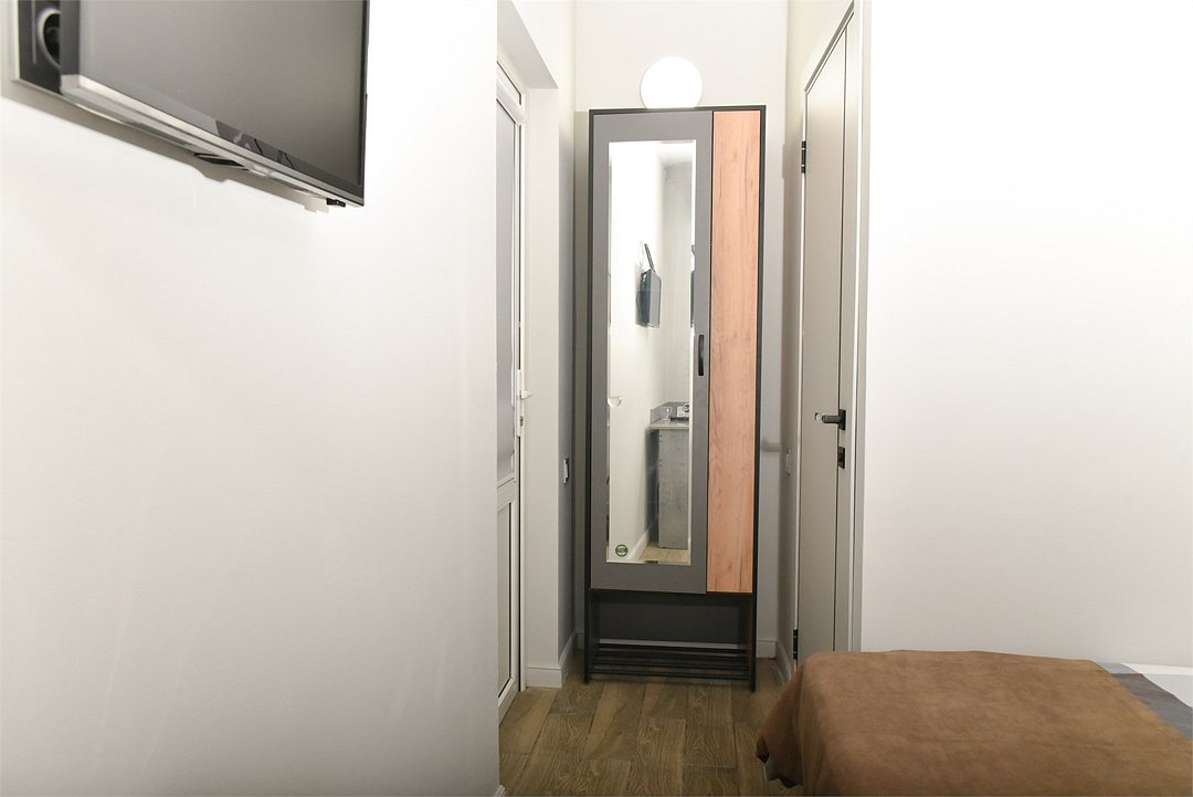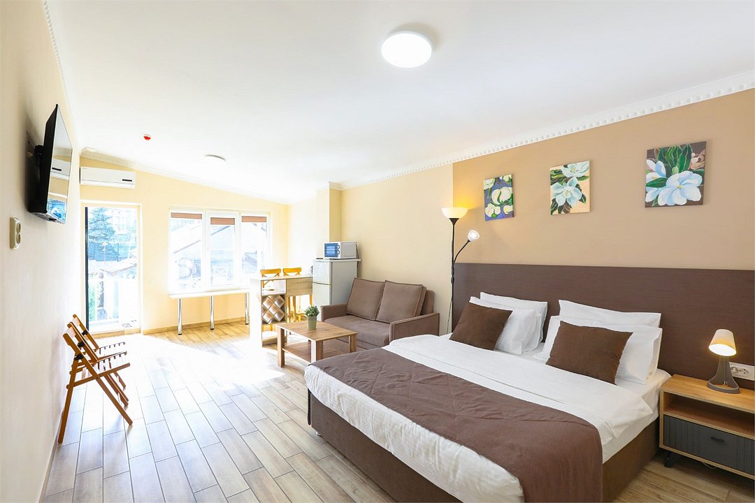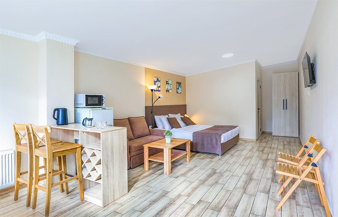 спутниковое телевидение, Wi-Fi, кондиционер, обогреватель, гидромассажный душ, терраса, полутораспальная кровать, гипоаллергенное белье, ортопедический матрас, тумбы, стулья, шкаф для одежды, вешалки, обеденный стол, багажная тумба, мебельный гарнитур, вид на город, плиточное покрытие, вид во двор, ламинат, стаканы, столовые приборы, сплит-система, сушилка для белья, телевизор с плоским экраном, мини-холодильник, москитная сетка, номер для некурящих, рабочий столВ гостиничном номере