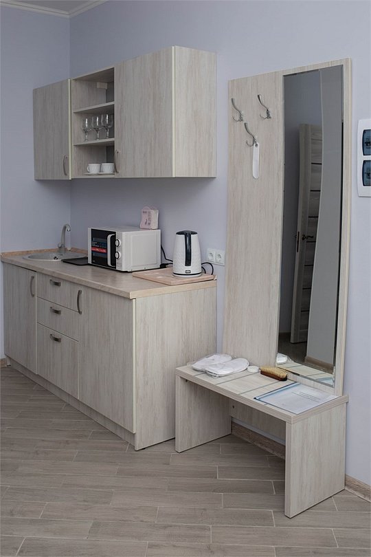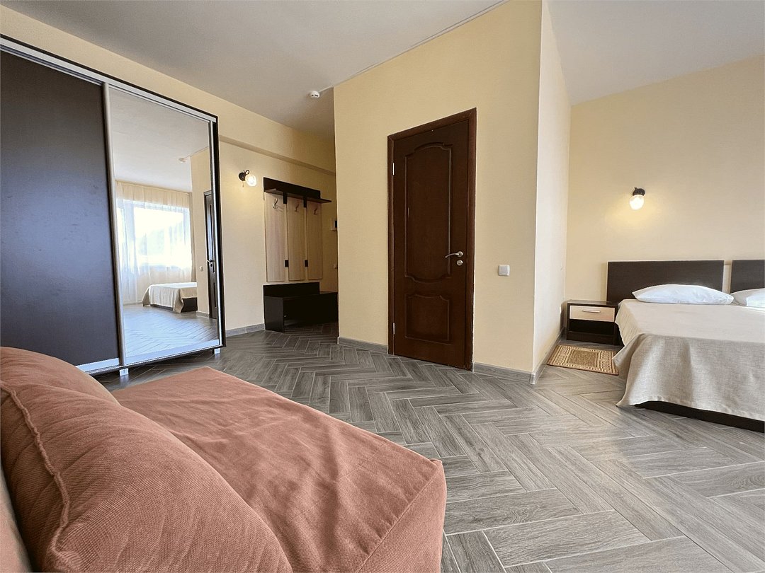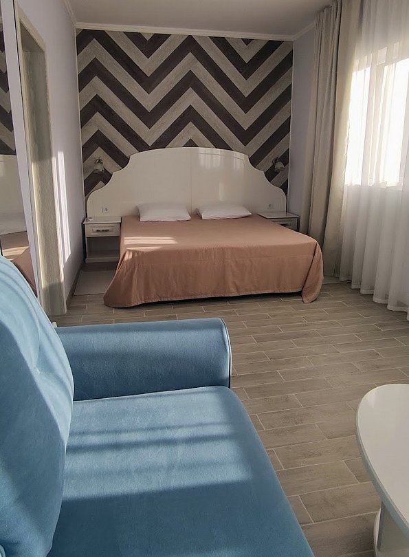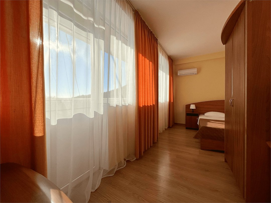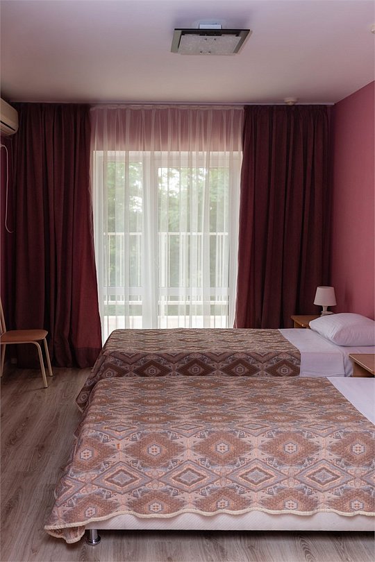 Номер категории "Комфорт" Комфортный двухместный улучшенный номер. В комплектацию номера входит две кровати (полуторки), диван-кровать, две тумбочки, большой плательный шкаф, телевизор, кондиционер, чайник, холодильник, туалетная комната с душевой кабиной. Есть возможность разместить дополнительное место на раскладном диванчике. В каждом номере есть балкон, с которого можно полюбоваться приятным видом на море.Услуги и удобства