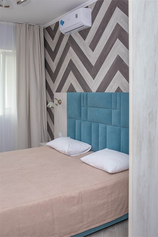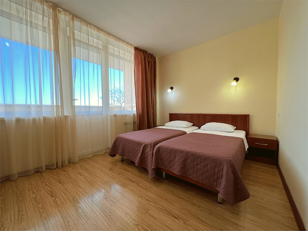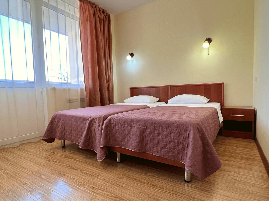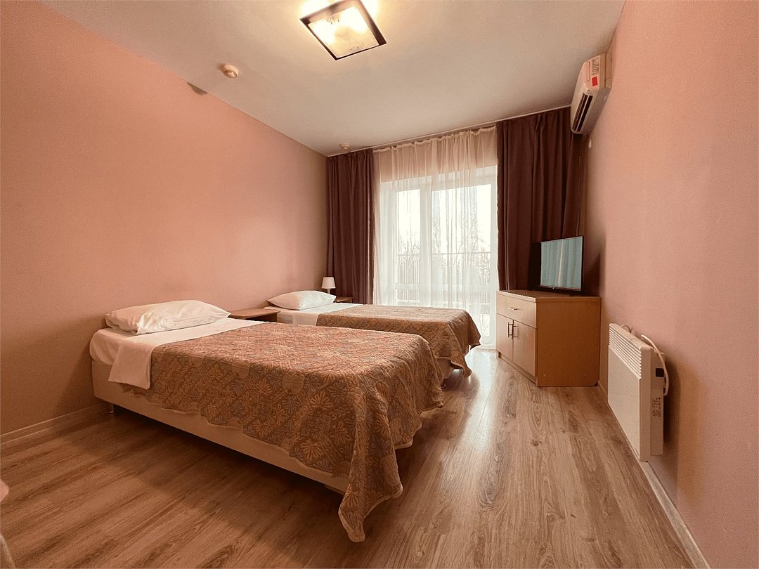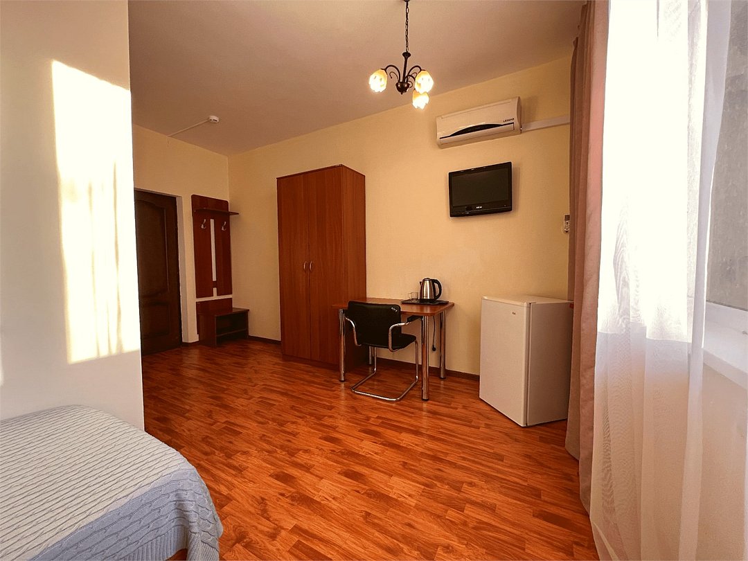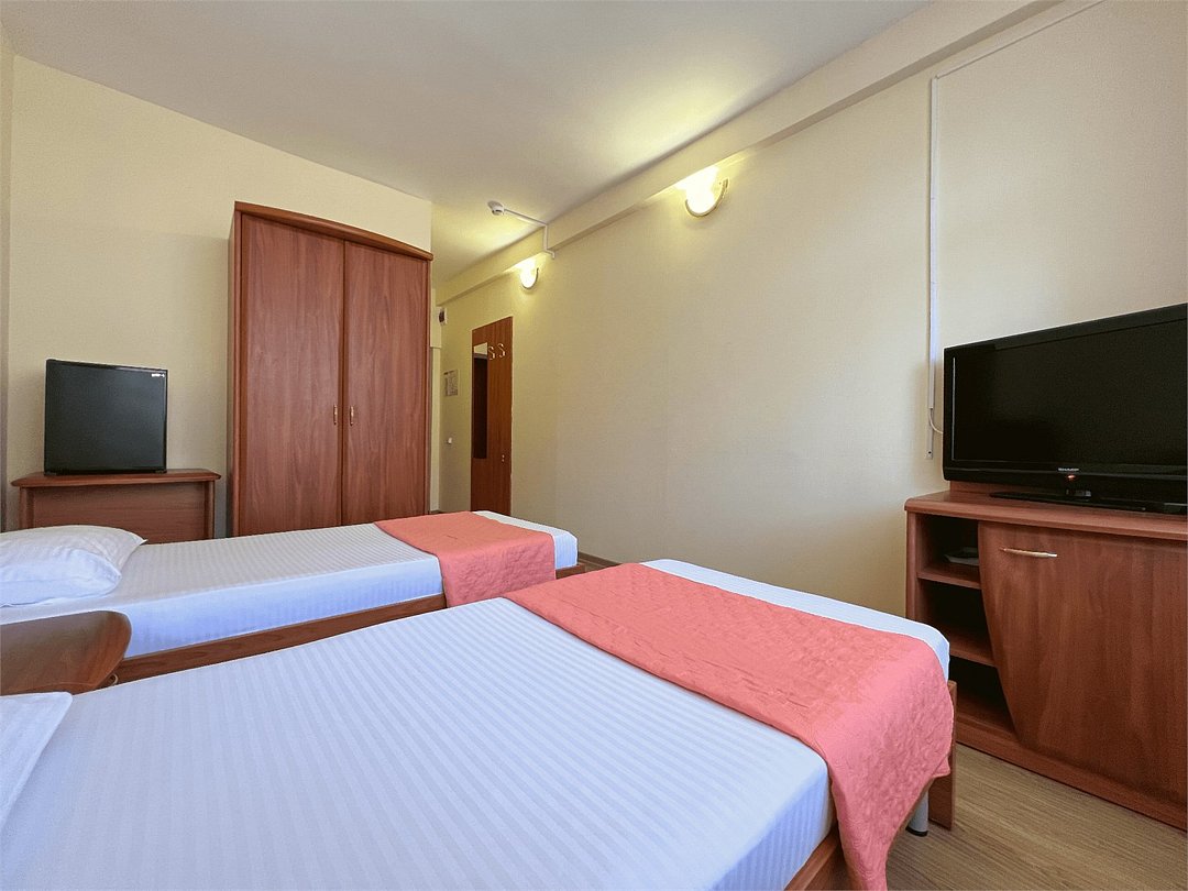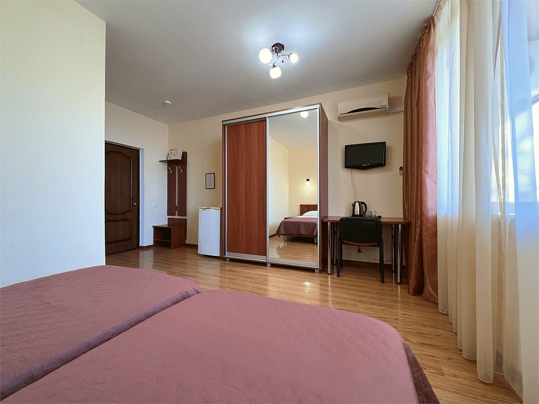 Двухместный номер категории "Стандарт". В номере есть все для комфортного пребывания двух отдыхающих. Номер оснащен кондиционером, телевизором, барным холодильником. Санузел совместный. Просторный балкон.Услуги и удобства