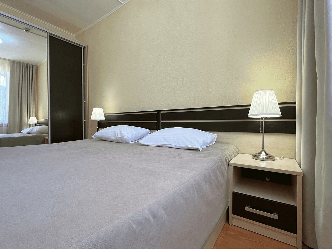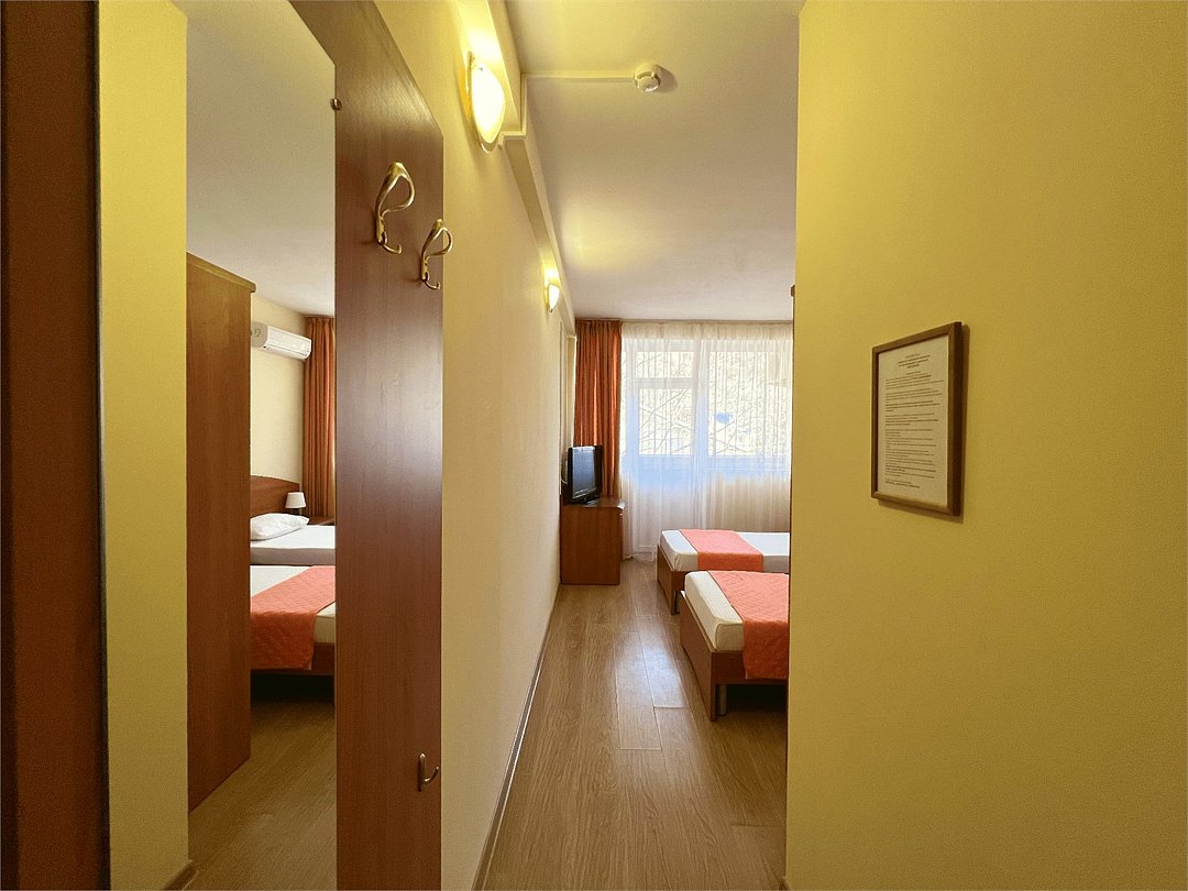Просторный четырехместный номер, с балконом. Две комнаты, в каждой комнате 2 кровати, две тумбочки, шкаф для одежды, телевизор, кондиционер. В номере есть холодильник, обеденный стол, чайник. Номер подходит для семейных пар с детьми.Услуги и удобства