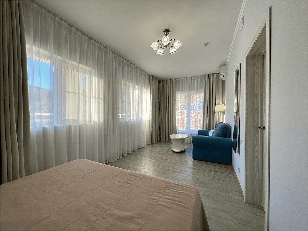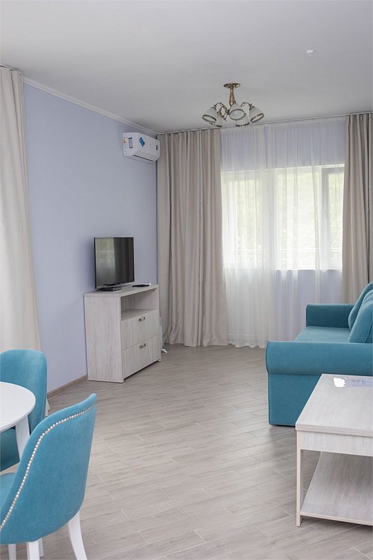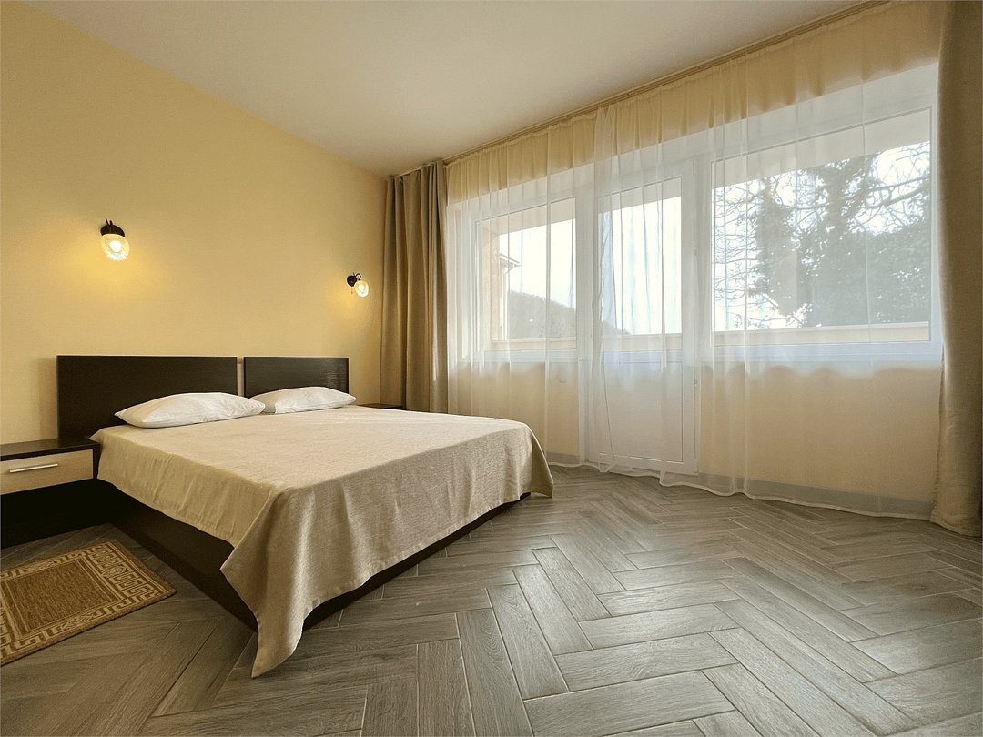 Двухкомнатный просторный номер категории "Апартаменты" Спальня и просторная гостиная, мини кухня, обеденная зона. Каждая комната имеет выход на балкон с прекрасным видом на горы и лес.Услуги и удобства